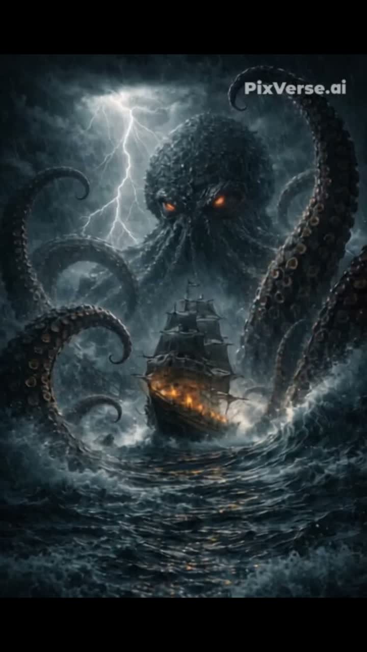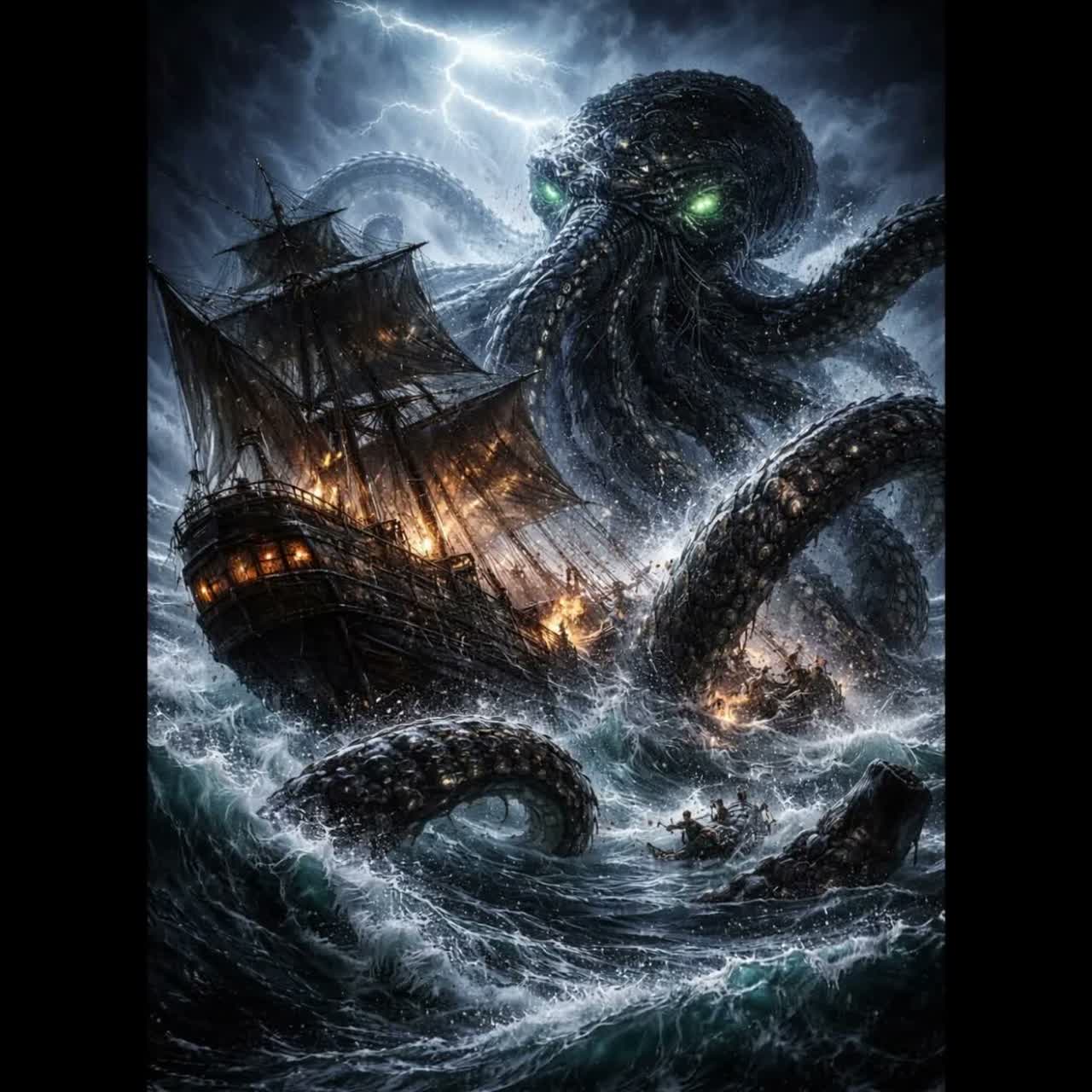 gothic doom metal, maritime doom, 78 BPM, heavy marching groove, aggressive and punchy half-time stomp, powerful tom-heavy drums with strong transient удар, distorted driving power riffs, low organ drones, dark string ostinato, thunder FX, punchy low end, roomy snare with impact, percussive and physical rhythm, raw and forceful energy, restrained orchestral layers supporting the groove, not dominating, ritual chant break, bridge keeps the rhythm alive with heavy half-time drums and continuous driving pulse, no slowdown, maintaining tension and forward motion, female vocal intense, commanding and forceful, no choir in bridge, final chorus explodes into a relentless unison chant of “Octopus Arms” with high energy, percussive delivery, chaotic but controlled, designed to feel powerful and foot-stomping, no soft or passive sections