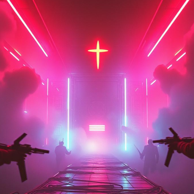 A cyberpunk rap track opens with dark synths layered over deep, atmospheric Gregorian chants, Gritty female vocals drive intense verses alongside distorted guitars and programmed beats, The chorus explodes with electric rock energy, blending chants, synths, and relentless rhythms for a last-battle climax