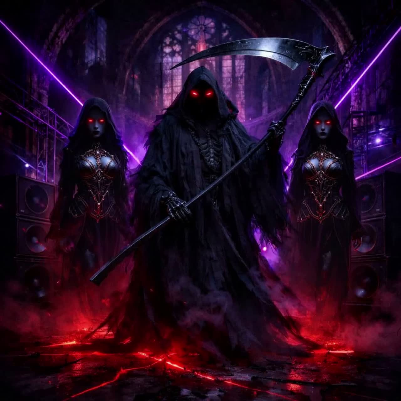 Extreme chaotic gothic death-industrial metal, Xmas reaper nightmare atmosphere, Very fast and unstable tempo (220–300 BPM fluctuations), blast beats colliding with doom-slow drops, distorted sleigh bells mangled through reverb and delay, Detuned guitars in Drop A#/Drop G#, wall-of-noise riffs, grinding bass that rattles like a coffin lid, Vocals: layered male + female, whispered threats, manic laughter, growls, distant choir screams, crowd-chant hooks, Sound design: chains dragging on stone, blades scraping bone, wet cracking impacts, heartbeat sub-bass, collapsing structure, Mood: violent, ritualistic, apocalyptic, blood-soaked holiday funeral, reaper carnival gone wrong, No clean pop structure, unpredictable transitions, abrupt stops, sudden explosions, chaos over melody, Feels like a cursed Christmas fair overseen by Death himself