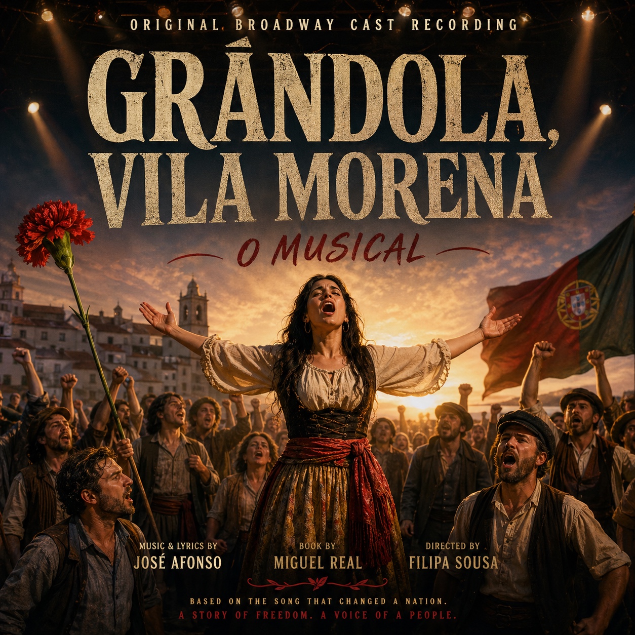 Portuguese musical theater, Broadway cast recording, Lisbon folk-pop, male female ensemble, full-throated belt, half-spoken intro, accordion countermelody, nylon-string guitar strums, handclap backbeat, marching snare, punchy horn hits, orchestral strings, plate reverb, tape saturation, stereo width, 128 BPM, key-change lift, bittersweet nostalgia, festive catharsis