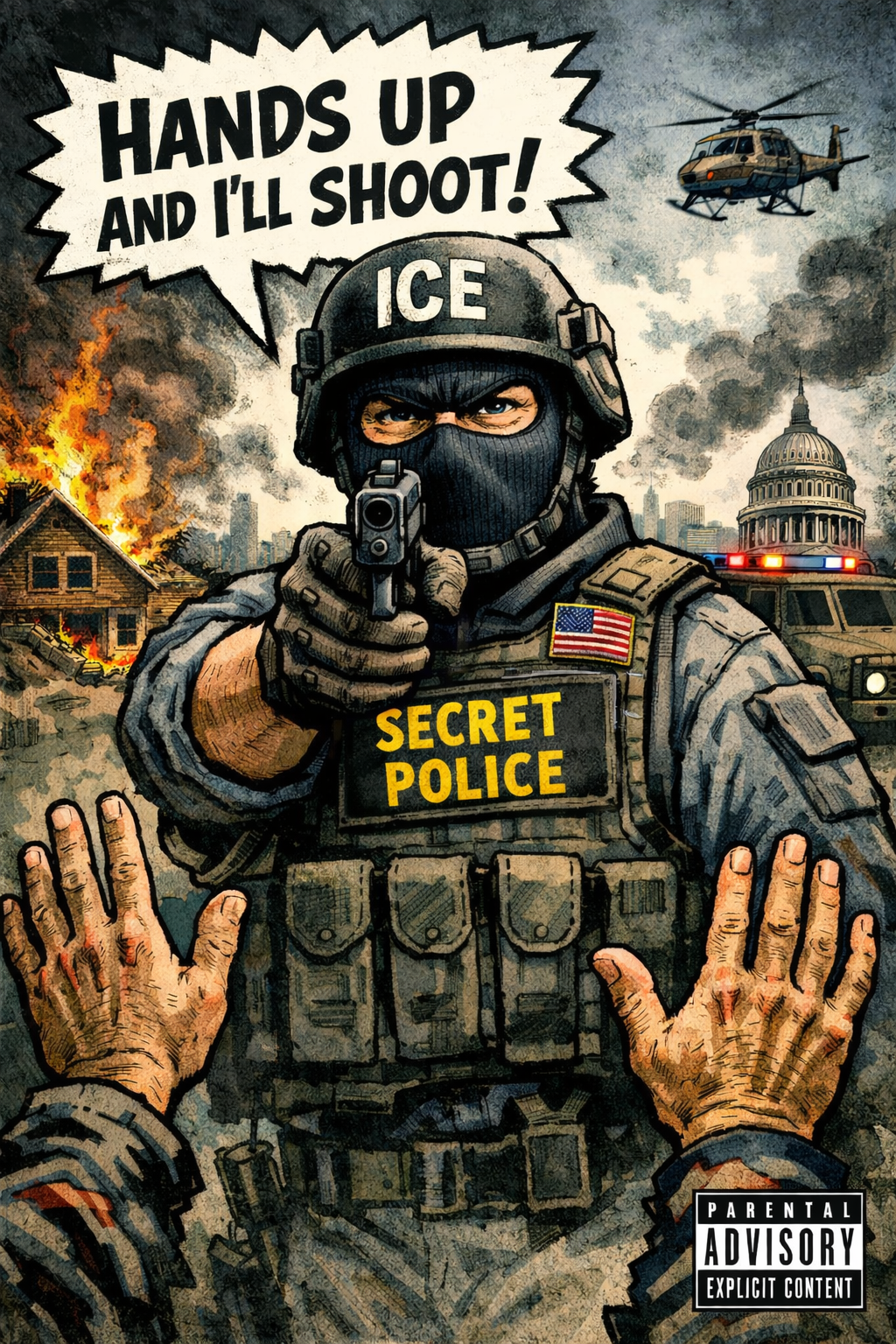 A gritty ’90s-inspired grunge-rap protest track built on dusty boom-bap drums, loose blues-inflected guitar stabs, vinyl crackle, and a walking bass line, Male vocal delivery is half-spoken, half-rapped — conversational, world-weary, and bitter rather than aggressive, Minimal melody, heavy emphasis on rhythm and phrasing, The hook is chant-like and deadpan, designed to feel inevitable rather than explosive, Overall vibe is street-level realism: cigarette smoke, cracked sidewalks, media fatigue, and sharp observational truth, No polish, no gloss — raw, grounded, and intelligently angry without shouting
