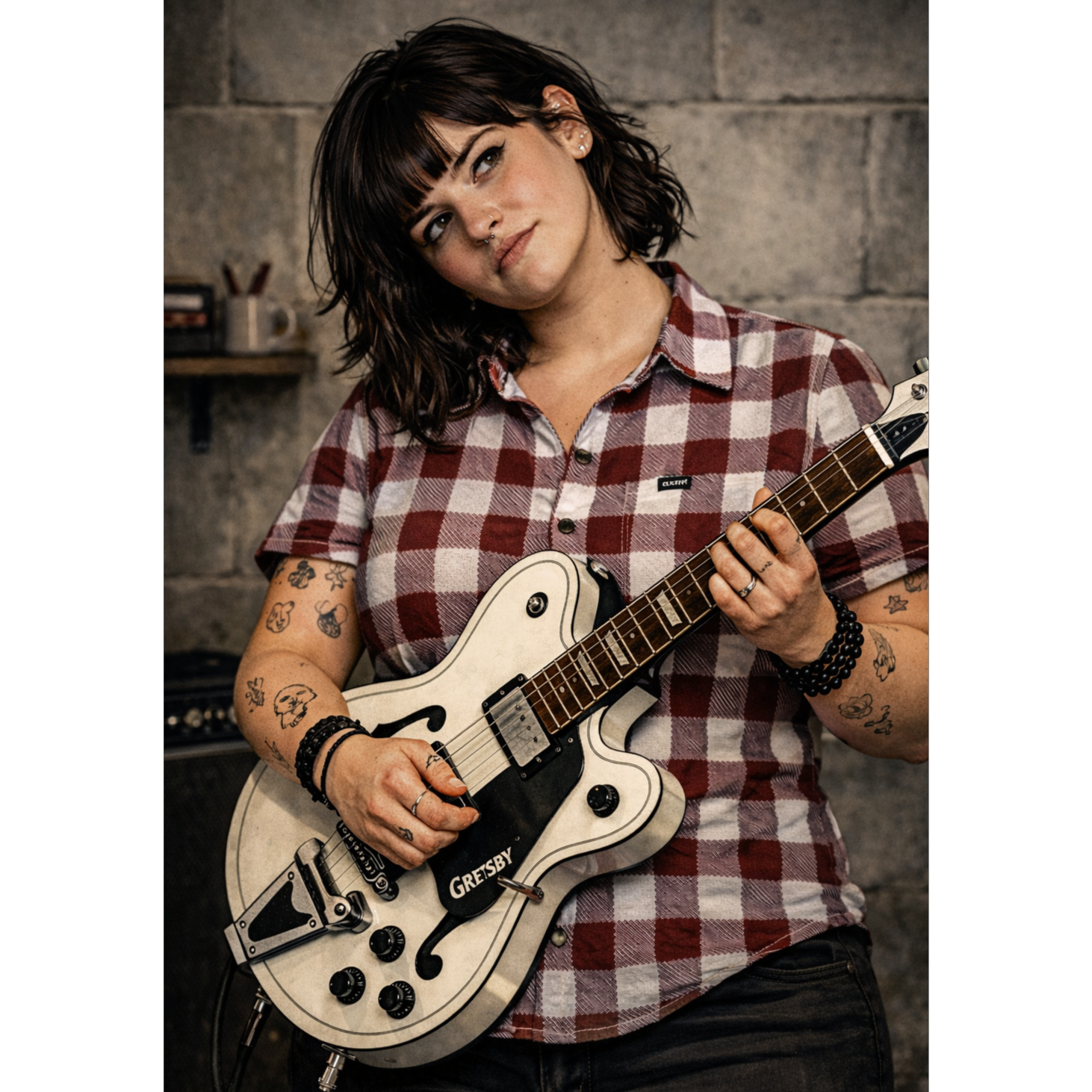 electro-punk rock built around a dirty, looping guitar riff driven through a massive, square-wave fuzz tone — thick, sputtering, and rubbery, with the low end chewing the groove rather than shredding it, Guitar attacks are short and percussive, slightly behind the beat, creating a swaggering push-pull feel, Rhythm section locks into a minimal funk pocket: dry kick, tight snare, stiff hi-hats with occasional open slaps, no fills, no swing excess — just pressure, Bass mirrors the riff with a synth-like grind, side-chained subtly to the kick for bounce, Female lead vocal is cool, declarative, and rhythm-first — spoken-sung delivery with clipped phrasing, playful authority, and zero apology, Tone is confident, amused, and sharp rather than aggressive; hooks land through repetition and attitude, not volume, Occasional call-and-response doubles and group shouts punctuate the groove, Production is raw but controlled: no polish, no nostalgia, punk chaos, Funk tension, club energy
