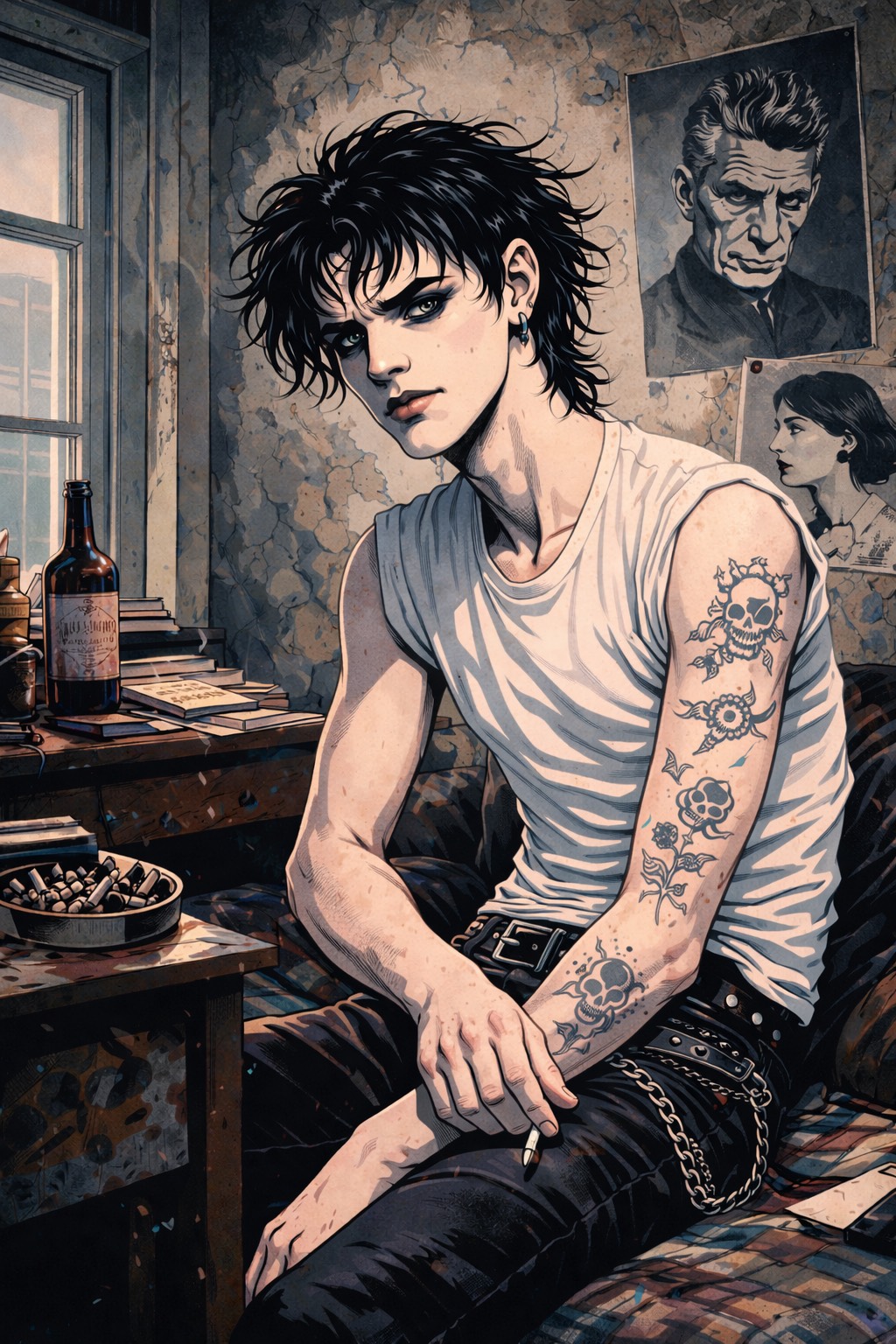 Strong UK Northern accent, Dark end-of-the-world UK new wave, gothcore obliterator for 2012, built on a catastrophic sub-bass that feels like the earth’s crust tearing open, early 2010s, restrained sonic menace, overdriven drum machine pounding a brutal alt-rock/nu-metal stomp with a gated snare that hits like a car door slam and a kick that sounds welded from steel, filthy fuzz-bass mangled through a ZVEX Woolly Mammoth wall doubling with vicious sub-bass for maximum pressure, vocals delivered in a deep sexy rolling Manchester baritone— half-sung, half-conversational— like horny sex, mix pushed absurdly loud with savage multiband saturation so everything sounds scorched, collapsing, and absolutely unhinged, the whole track a horny 2012 garage goth rocker designed to feel like the final riff you hear before the sky caves in, nu metal
