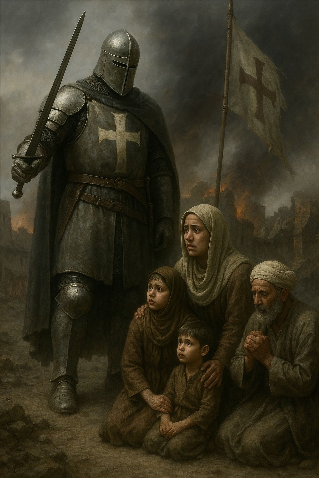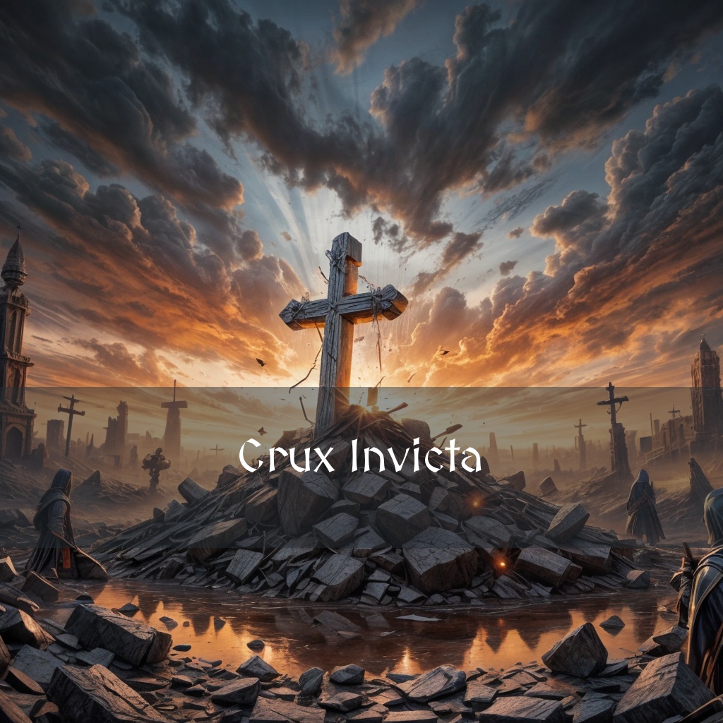 Mood: Triumphant, apocalyptic, militant, sacred, Scene: A crusader army marches into divine battle under the sign of the Cross, Their faith is unshaken, their cause righteous, and their chant echoes across burning cities and