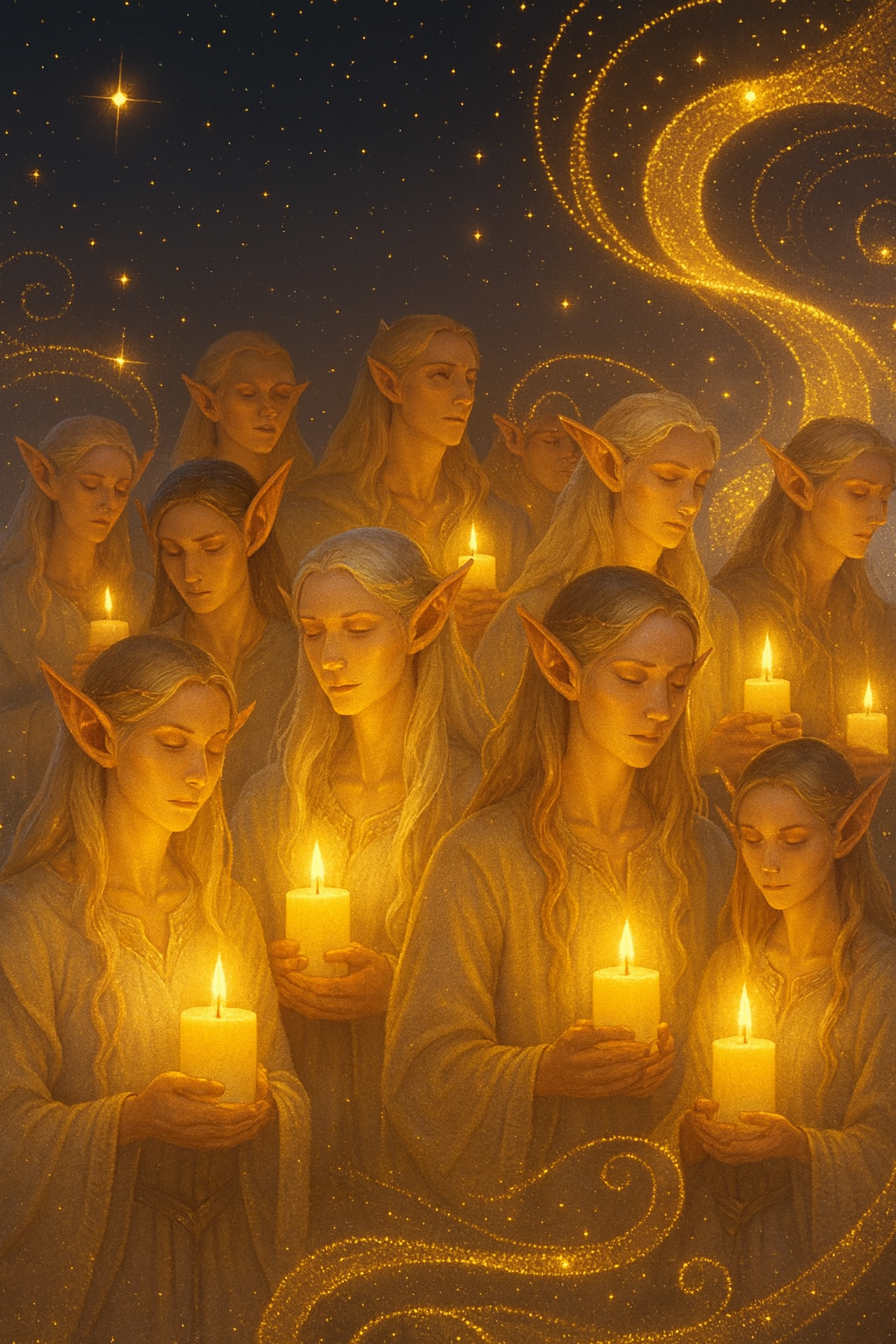 Multi-voice choral hymn in Sindarin (Tolkien-style Elvish), Sacred, warm, hopeful, timeless, Candlelight atmosphere, Slow tempo (60–70 BPM), Minor key, final modulation to major, [Intro] Whispered choir, soft humming on “galad”, distant reverb, [Verse] Solo alto or duet (alto/tenor), intimate, clear diction, [Chorus] Full SATB choir, hymn-like harmony, sopranos lead, basses sustain, [Verse 2] Call & response: female solo answered by low male choir, [Bridge] Emotional, first women’s choir only, men join underneath, [Final Chorus] Grand full choir, uplifting, wide cinematic sound, Optional children’s choir doubling soprano, [Outro] Long sustained chord, fading echo “galad… galad…”