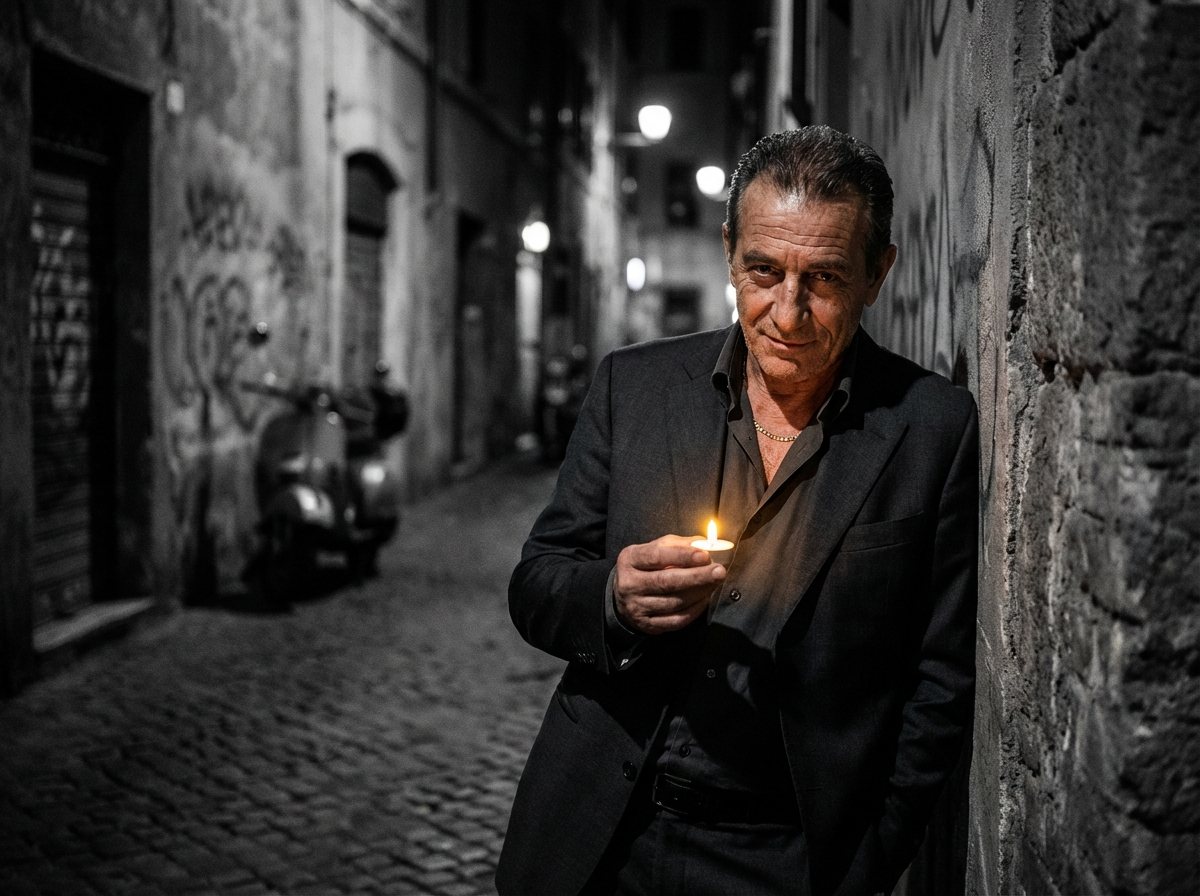 Italian gangster rap / conscious street rap, dark and emotional, ~90–95 bpm, Heavy boom-bap / trap hybrid beat with deep 808 bass, tight punchy kick and snare, subtle hi-hat rolls, Gritty urban atmosphere, faint sirens and city ambience in the background, Main vocal in Italian, aggressive but heartfelt flow, mix of spoken introspection and confident street attitude, male voice with slight rasp, Minimal melodic elements: moody piano or detuned synth pad, occasional distant choir pad to underline the “candela / luce” theme, Big, catchy hook with layered vocals on the ritornello, verses more dry and upfront, Overall vibe: serious but hopeful, from the ghetto at night, small light in the darkness, cinematic gangsta mood, no auto-tune pop, more raw and classic than commercial trap