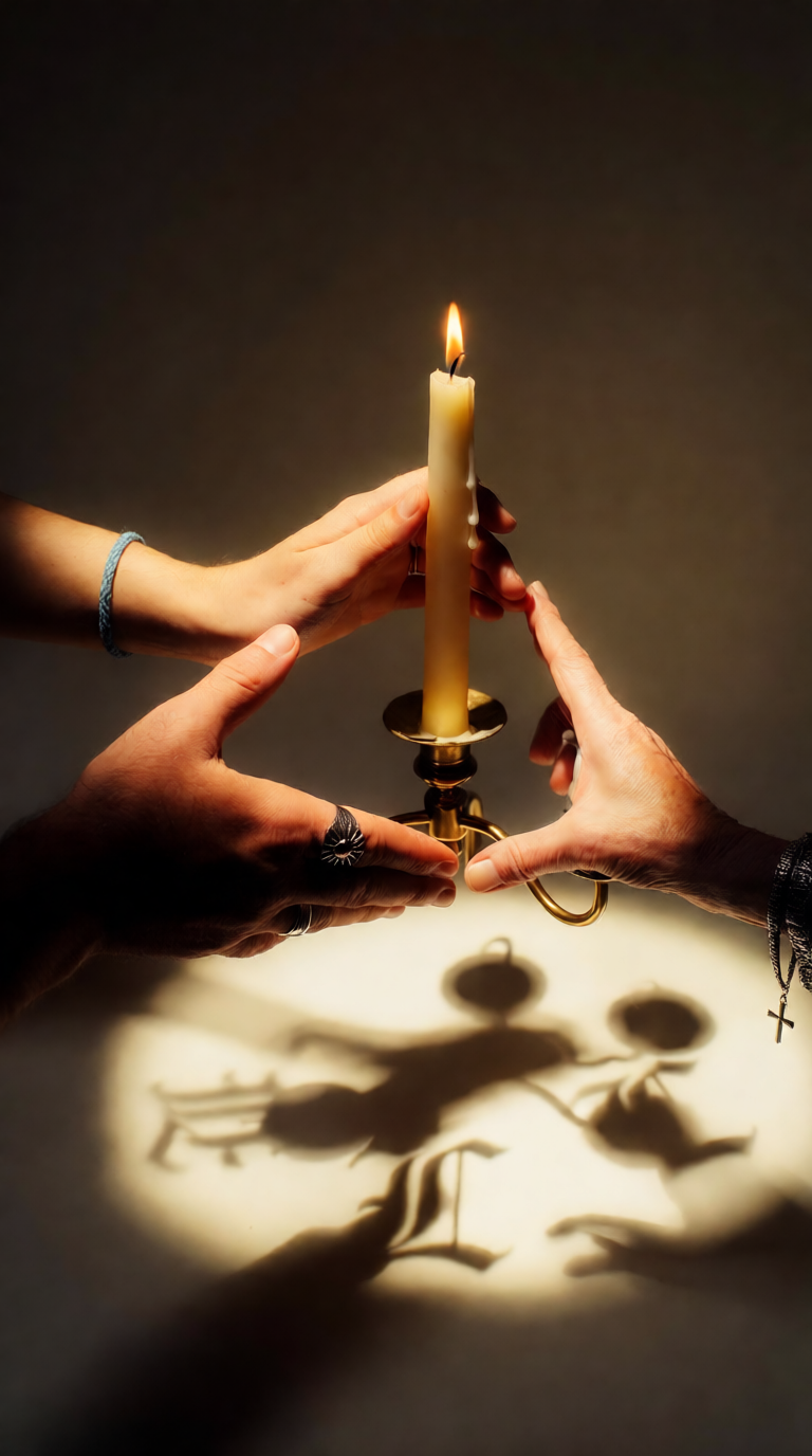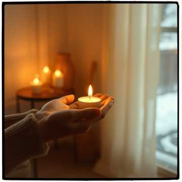 Slow unplugged indie-acoustic ballad with gentle swing and clear syncopation — sincere, slow and heartfelt, with a background choir, Tempo ~68 BPM, soft half-time swing with relaxed groove and warm pulse, Instrumentation: upright bass, handpan or cajón, brushed snare, acoustic and hollow-body guitar, delicate glockenspiel, and subtle vibraphone shimmer, Male lead vocal: warm, articulate baritone — honest tone, calm phrasing, gentle dynamics, clear diction, Background choir only in refrains: soft, luminous harmonies that lift naturally without exaggeration, Mood: peaceful, genuine, candlelit and human — slow, steady warmth that fills the room softly, Production: clean unplugged mix, close-mic vocals