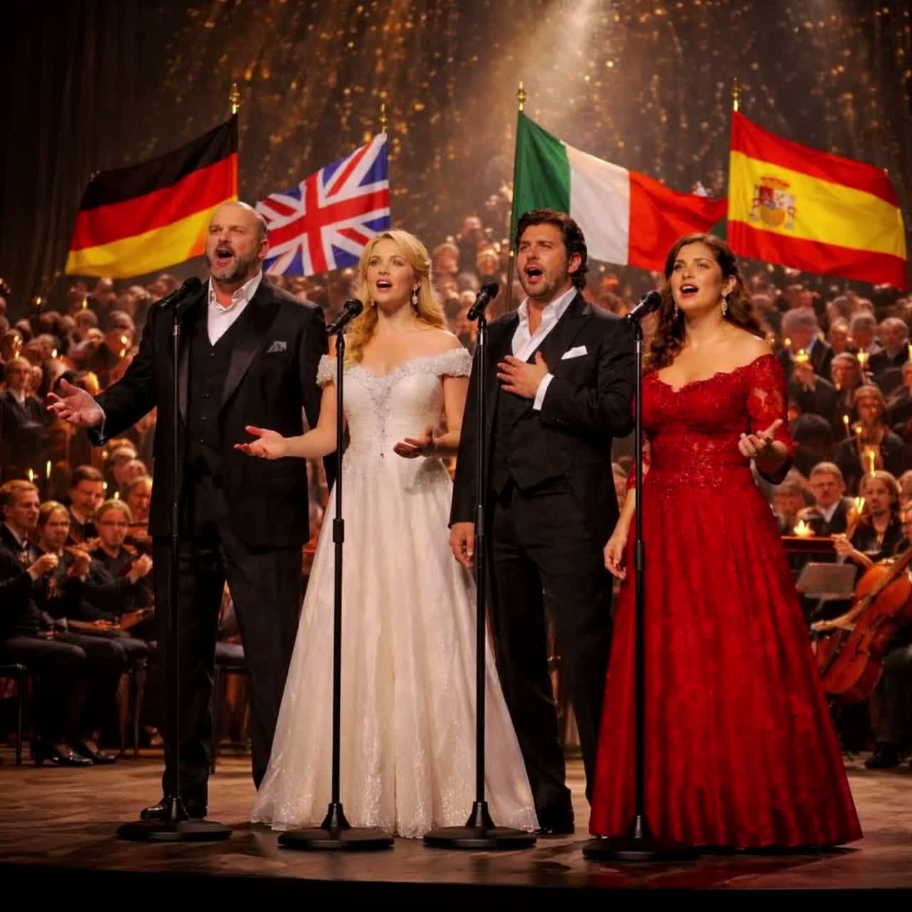 High-Fidelity Classical Opera, Grand Orchestration, Stage-Separation: German Bass Center, English Soprano Left, Italian Tenor Right, Spanish Alto Foreground, 120 BPM, Instruments: Grand strings, bold brass, harp, woodwinds, classical guitar, cellos, timpani, Mix: Ultra-wide soundstage, crystal-clear instrument separation, massive headroom, crystalline highs, EQ: Air-boost, Production: Wide dynamic range, Duck-Orchestra-under-Vocals, natural room acoustics, transparent mastering, zero-compression-artifacts, precise transients, Soloist counterpoint, intricate orchestral weaving