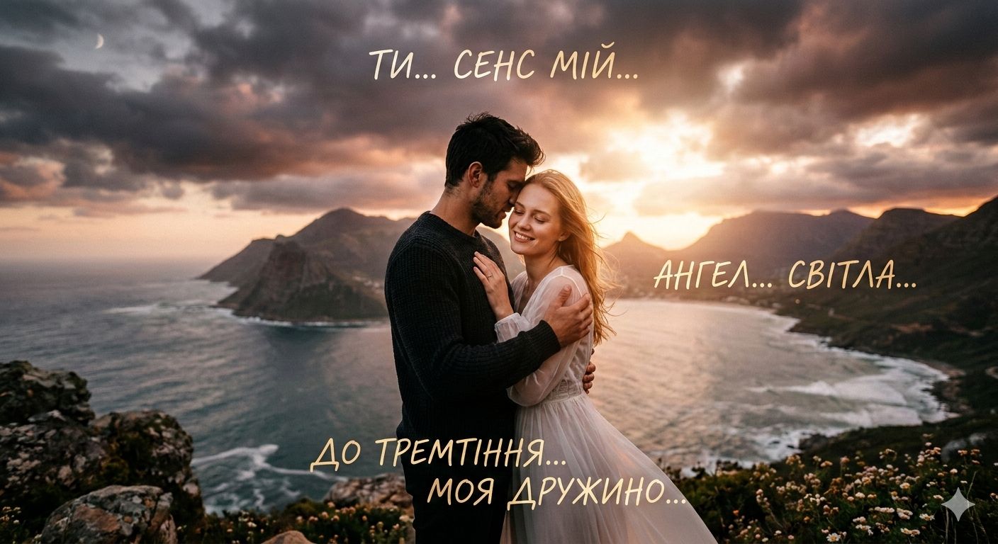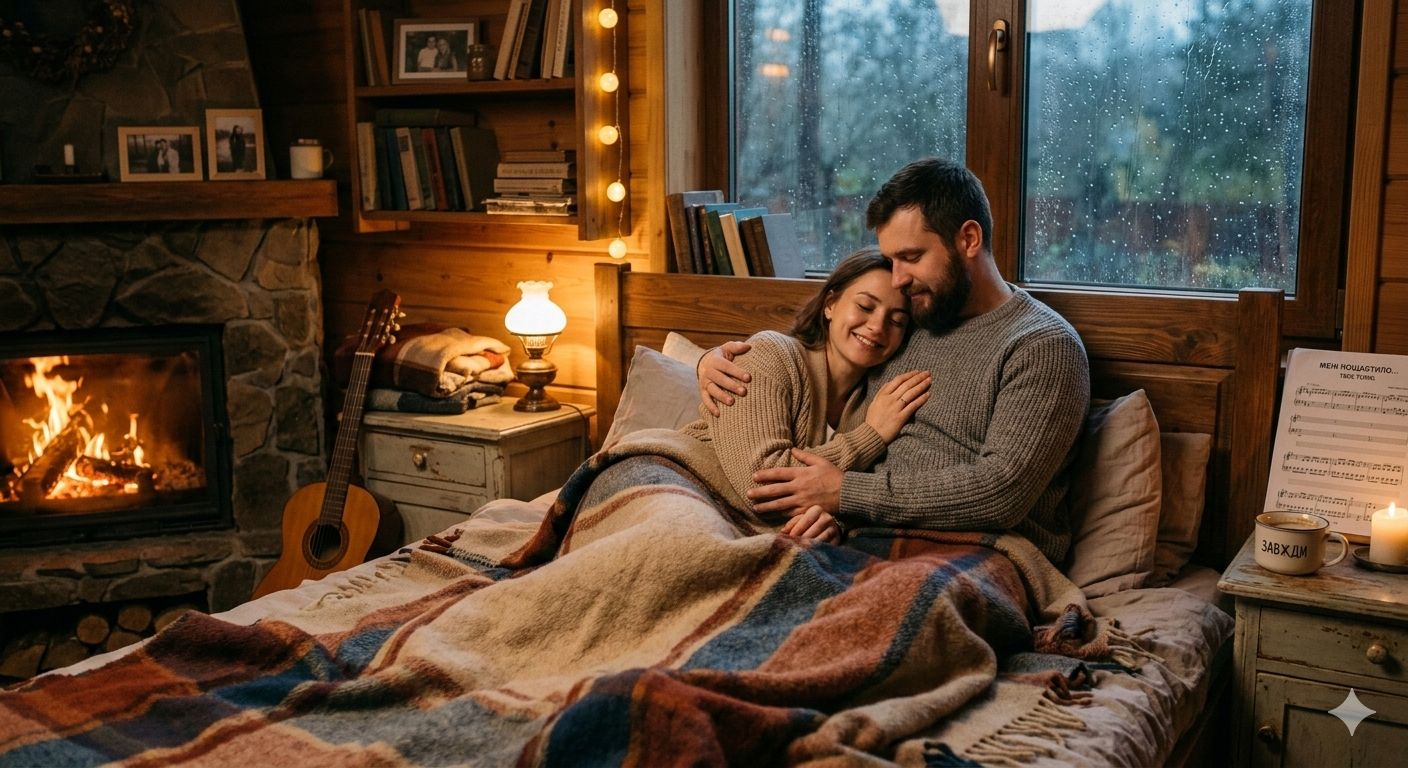 Tender slow acoustic ballad, 60 BPM, delicate fingerpicked acoustic guitar, warm intimate male vocals, soft bass, minimal piano, Ukrainian romantic love song to wife, soulmate forever, cozy whisper atmosphere, heartfelt devotion, like a late-night serenade