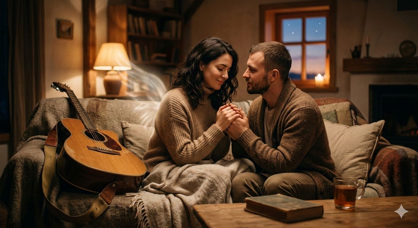 Intimate moody folk rock ballad, acoustic fingerpicked guitar, upright bass, brushed percussion, close-mic'd warm male vocals, soft harmonies, nostalgic cozy 70s vibe, slow 80 BPM, hygge fireplace rain, emotional tender love song, minimal warm production, whispered bridge, fading outro