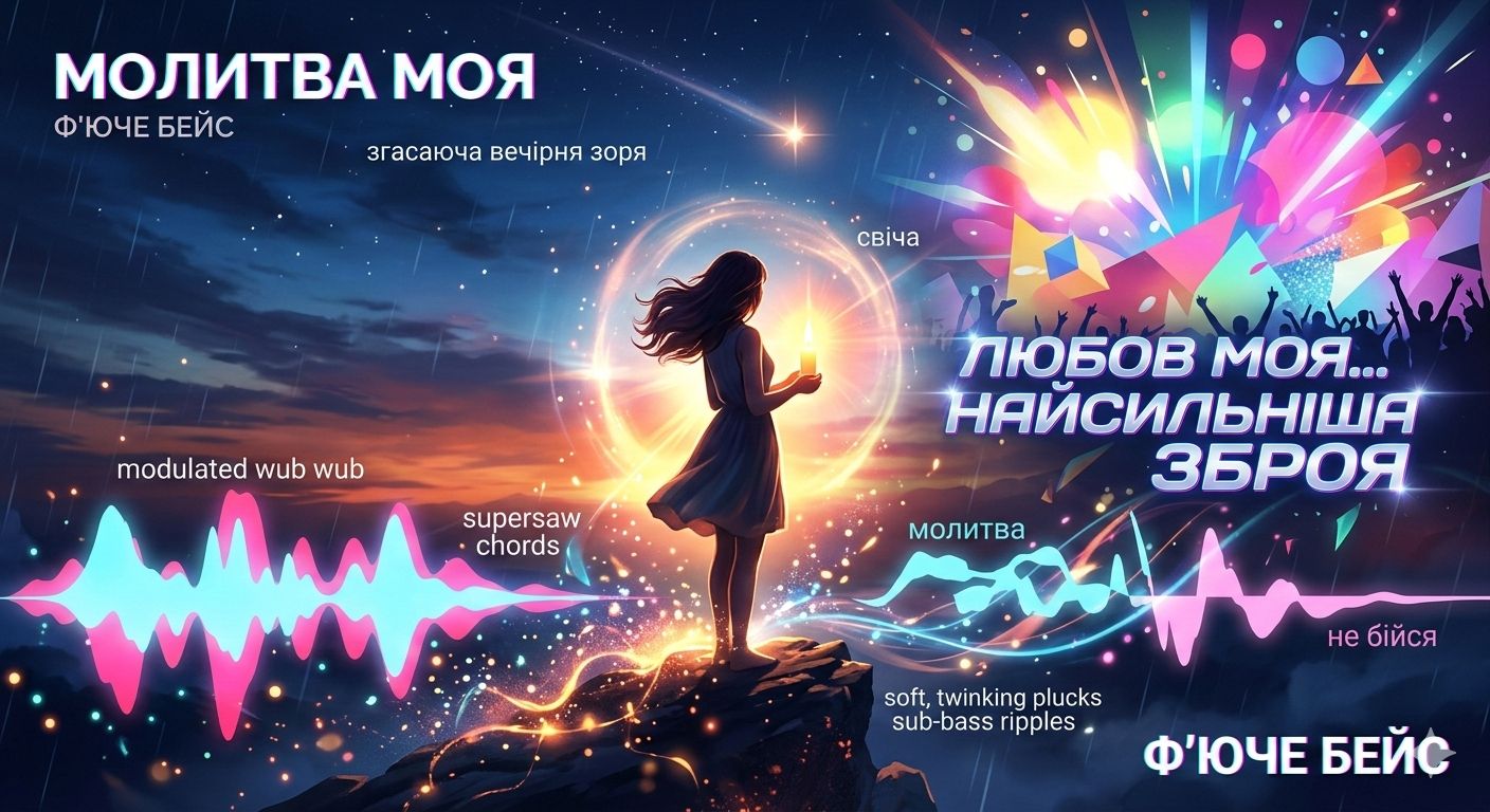Uplifting emotional future bass, 145 BPM, bright supersaw chords, sparkling plucks, wobbly clean bass, punchy kick, crisp hi-hats, lush pads, Crystal clear high-end mix, wide stereo, radio-ready mastering, no mud, Deep warm male vocals, baritone lead, ultra clear pronunciation, forward in mix, light natural autotune, breathy verses, soaring powerful chorus with harmonies, emotional hopeful delivery, Prominent intelligible lyrics, cut through bass, Structure: dreamy intro reversed vocals → half-time verse → big riser build → euphoric drop wobbly bass + vocal chops → piano breakdown → bigger drop → echo fade outro, High fidelity, beautiful shining sound, festival mainstage vibe, Emotional prayer theme: light, faith, love vs darkness, Key: future bass, melodic, clear male vocals, crisp production, uplifting cinematic, professional studio mix, crisp highs, tight low end, wide stereo image, front-and-center vocals, prominent lead vocal, less wet mix