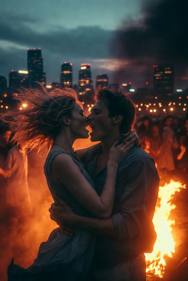 Intense passionate romantic rock ballad, dark sensual alternative pop with fire and obsession, cinematic love song full of raw desire, building from intimate whisper to explosive powerful chorus, deep husky male lead vocals with emotional cracks, soaring belts, female ethereal backing, atmospheric guitars reverb delay, pulsing bass, dramatic piano strings orchestra swells, heavy drums build-up, subtle fire crackle synths, tempo 75 BPM verses rising to 95 in chorus, Ukrainian language lyrics, tags: burning passion, eternal flame, soul-consuming love, dramatic intense romance, heart on fire