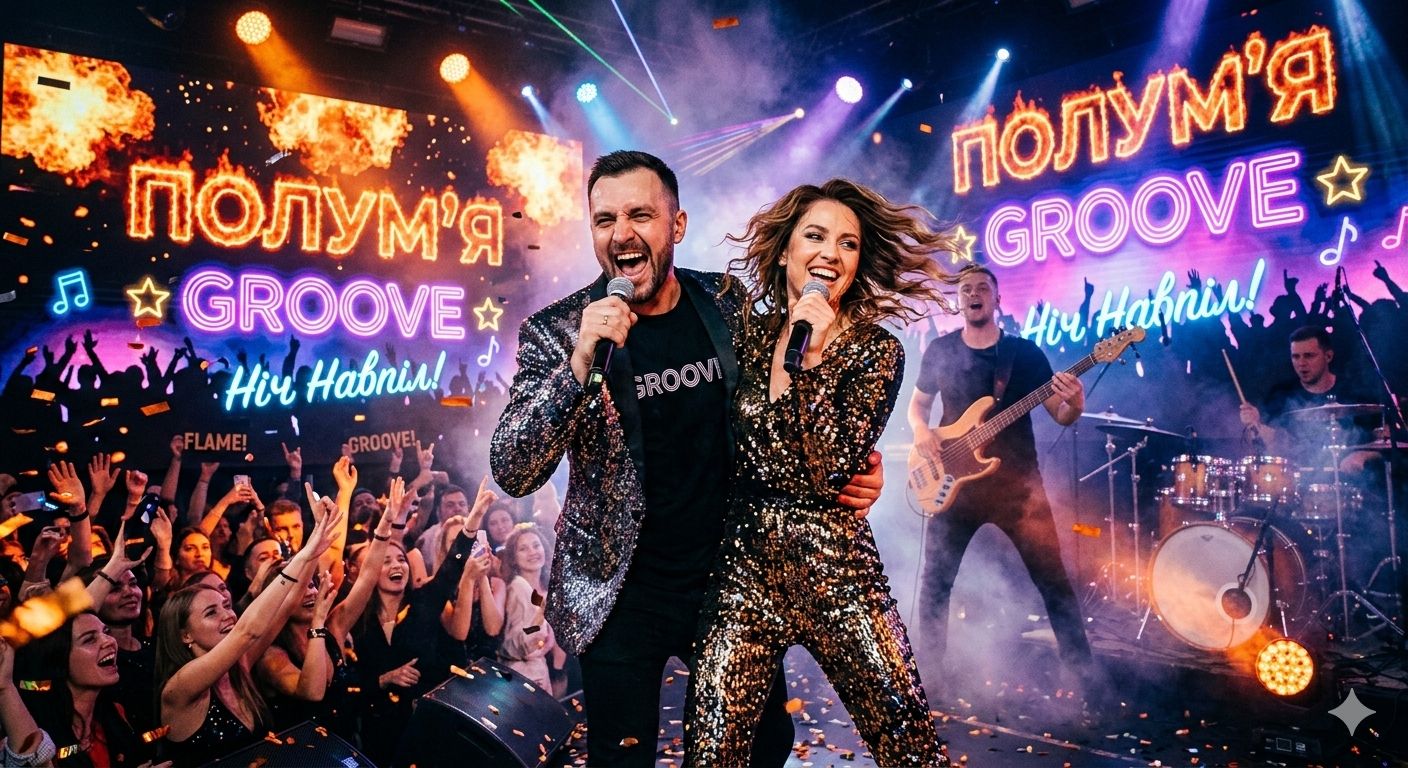 "High-energy disco-funk dance track, 120-128 BPM, upbeat and infectious groove, Heavy slapping funky bassline with prominent slap technique, wah-wah electric guitar riffs tearing through the mix, punchy brass horns stabs, shimmering disco synths, bright strings swells, tight claps and hand percussion, Retro 70s-80s disco vibe mixed with modern festival energy like Explosive drops with siren effects, crowd cheers, layered ad-libs and shouts Starts with rising synth intro + spoken "Turn it up!", builds into fast-flow verses, huge anthemic chorus with powerful male lead vocals (confident, passionate, sexy), backing vocals harmonies shouting key phrases, Bridge breakdown to near silence then massive build-up and final explosive chorus, Overall mood: pure euphoria, endless dancefloor love, celebration of eternal romance, non-stop party fire, Ukrainian lyrics vibe but English ad-libs and hooks, Very loud, polished, radio-ready production with big low-end and sparkling highs, "