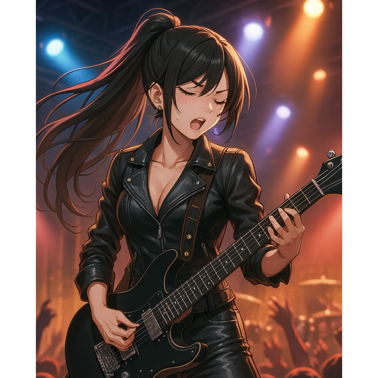 Modern Japanese rock (J-Rock) with a powerful, expressive female vocal using controlled growling and glottal attacks, Symphonic rock arrangement: electric guitar riffs, deep bass, dramatic piano, cinematic strings, punchy drums, Aggressive, emotional, wide dynamic range, Dark, rebellious, cinematic atmosphere, Inspired by modern anime theme songs, Mid-to-fast tempo (105–130 BPM), Focus on raw, edgy, and rhythmic vocal delivery