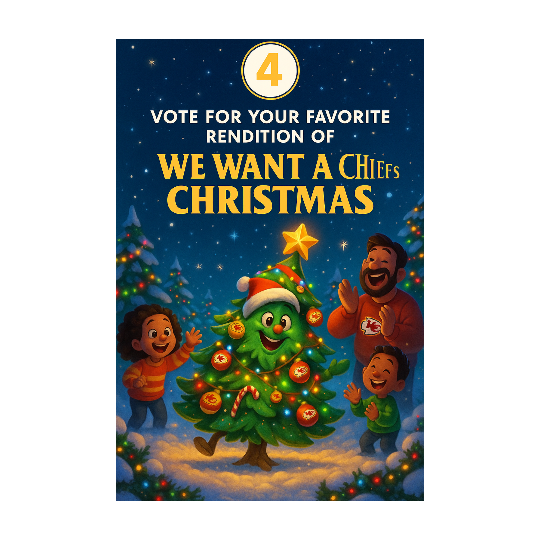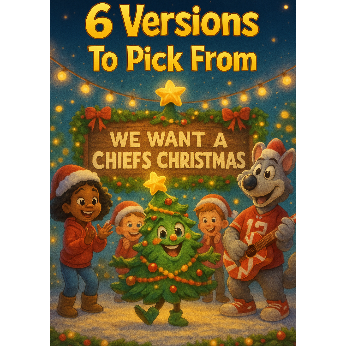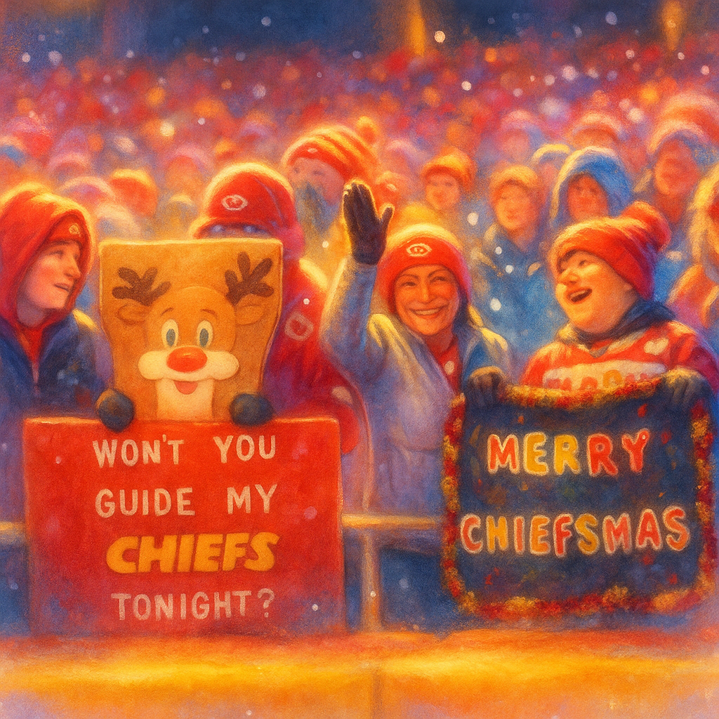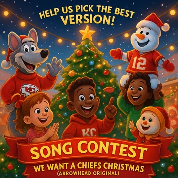 Viral stadium-pop holiday anthem with hip-hop bounce and chantable hooks, Tempo 108 BPM, Key G→A, Big trap drums, 808 subs, brass stabs, sleigh-bell hi-hats, and stomp-clap crowd energy, Male lead vocal—confident, humorous, radio-ready, Verses use rhythmic bars; chorus is melodic and anthemic, Include chant moments (‘How ’bout them Chiefs!’ / ‘We want a Chiefs Christmas!’), Mix should be punchy, modern, loud, streaming-optimized, Think LilNasish X ImagineDragonsesque × Swiftie Vibe stadium pop, but with Kansas City swagger and holiday humor, Tone: witty, proud, festive, fan-driven, ”