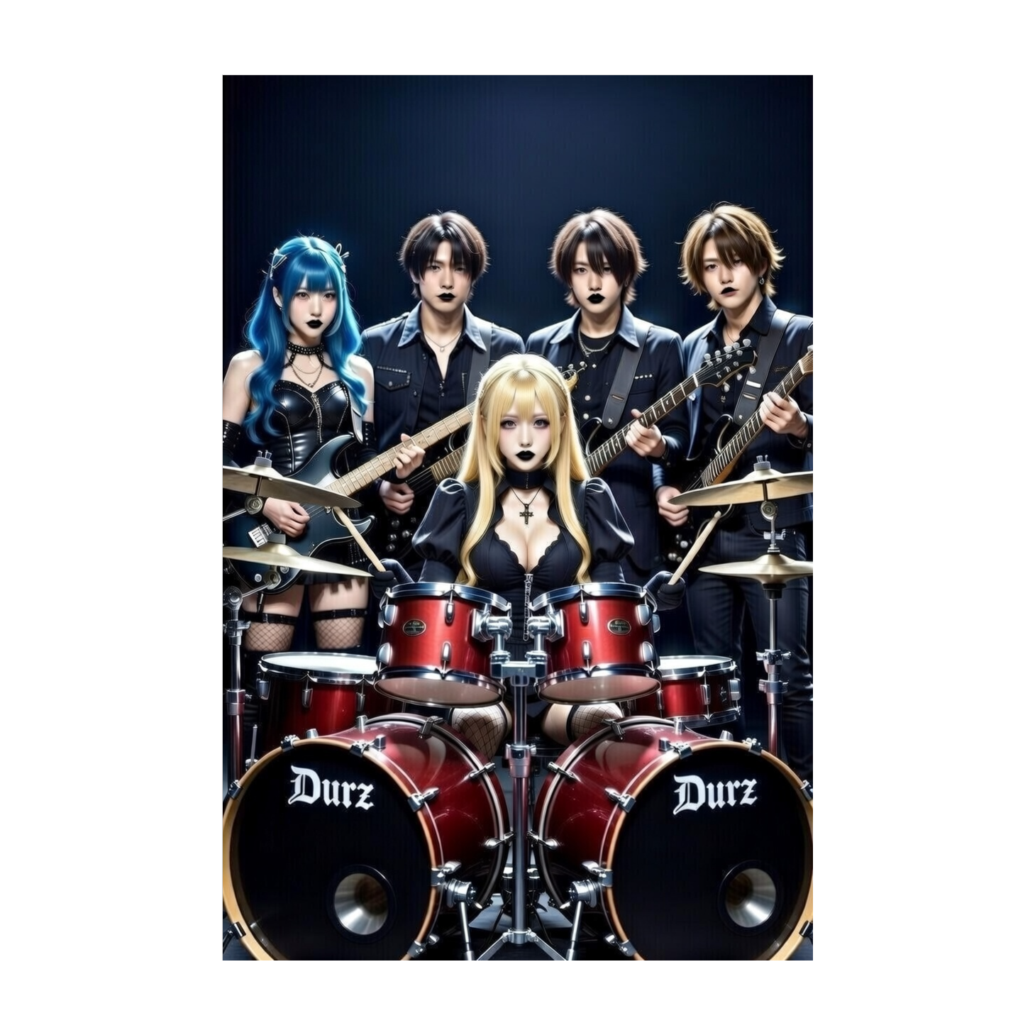 A progressive metal track at 160bpm with tempo shifts, emphasizing complex 7/8-string low-end riffs and technical feats—intense sweeping, rapid tapping, and intricate solos by black-haired guitarist Qay, Odd time signatures drive the rhythm section, Dark, atmospheric vocals deliver dramatic surges, building toward emotionally charged visual kei-inspired climaxes, Layered synth textures and dynamic drum patterns add depth, while each section pushes emotional intensity and technical showcase