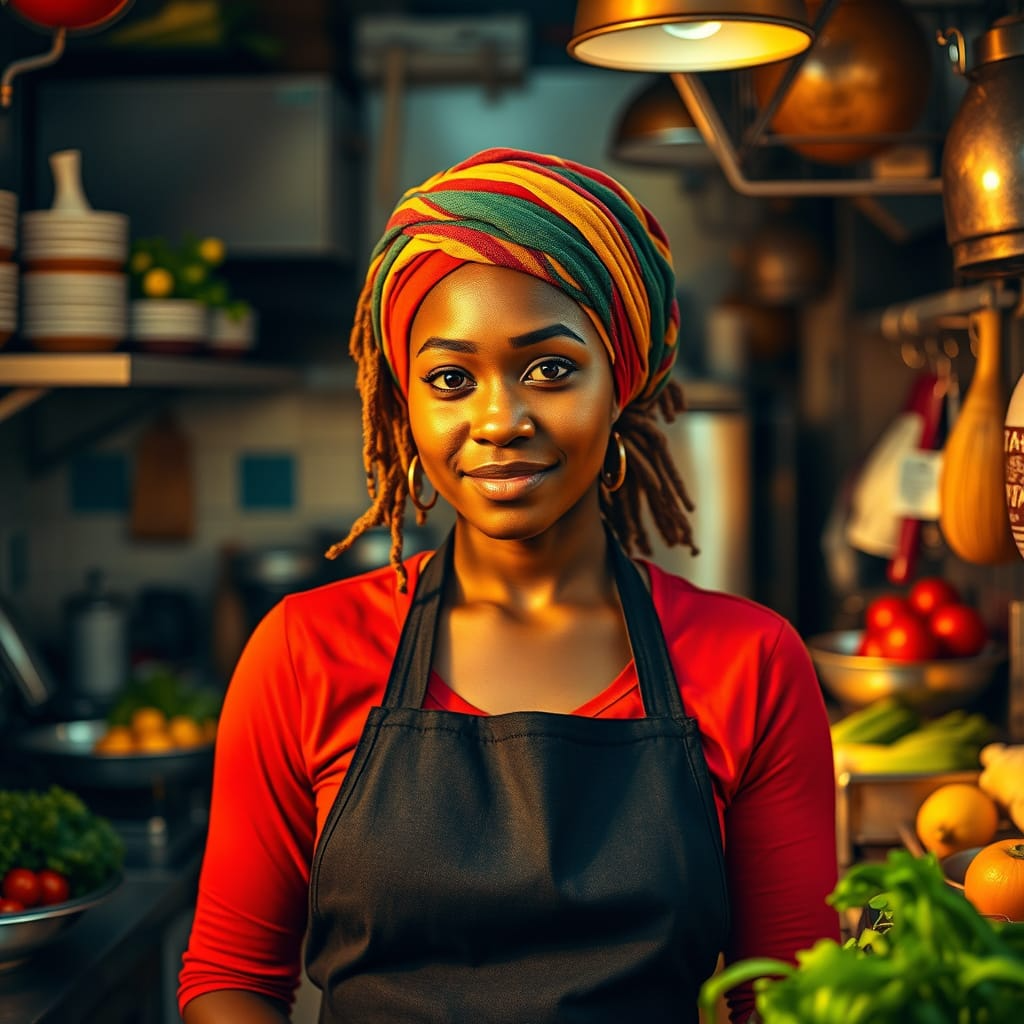 upbeat reggae groove, playful and flirtatious, female reggae vocals, warm and spicy Caribbean vibe, bass-driven rhythm, steel drum accents, kitchen sound effects (sizzling, chopping, spoon tapping, clinking plates), sensual and sunny mood