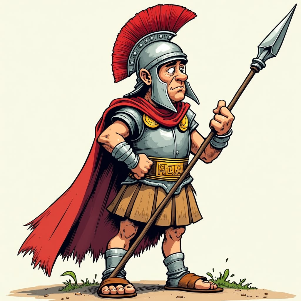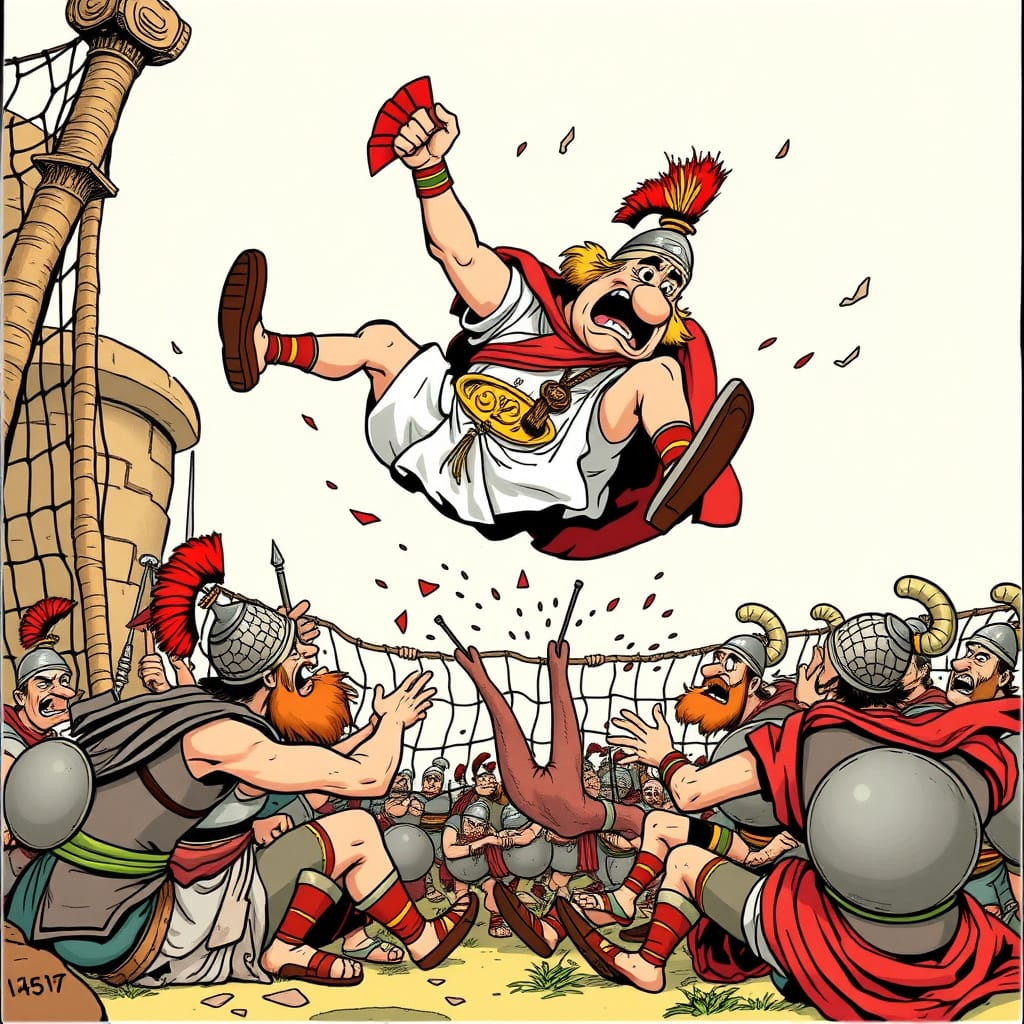 Epic heavy metal anthem, ancient Roman military vibe with modern edge, aggressive male choral vocals, Latin lyrics, pounding electric guitar riffs, thundering double bass drums, soaring trumpet fanfares, cinematic brass swells, intense and humorous, mid-tempo headbanging rhythm, no clean vocals, gritty and powerful