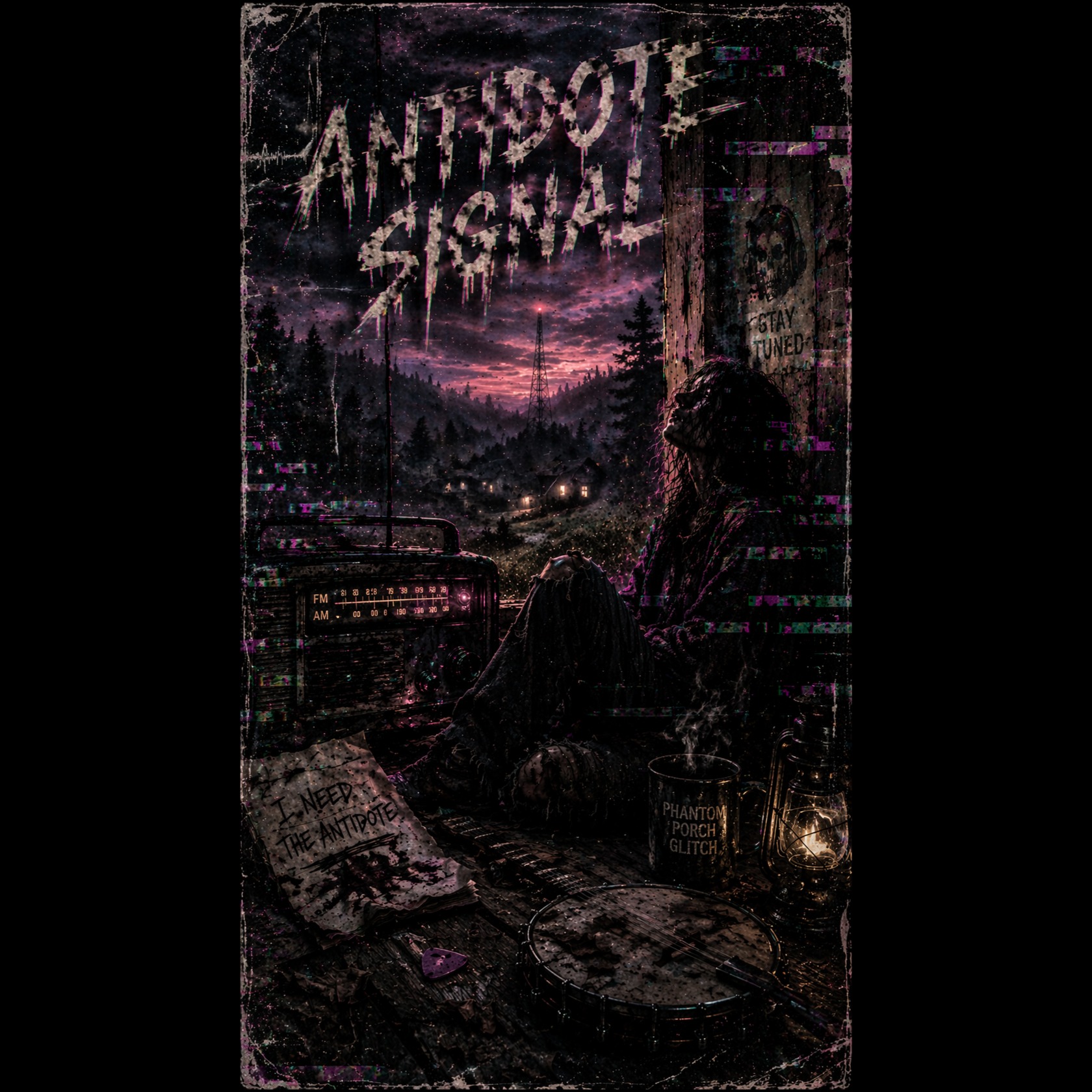 Phantom Porch Glitch fusion of Appalachian folk, grunge rock, glitchcore fragmentation, analog radio decay, and ghost choir harmonics, Begin with intimate banjo and fingerpicked acoustic textures, layered with environmental sounds like wood creaks and distant hum, Gradually introduce distorted grunge guitars and raw drum energy, Integrate glitchcore artifacts such as stutters, broken repetitions, abrupt silences, and vocal fragmentation, Use multi-layer voice splitting: main vocal, ghost harmonies, corrupted repeats, and faint radio whispers, Build from grounded human storytelling into full identity fracture, The track should feel like a deteriorating signal broadcast from an abandoned rural space, where emotion and identity collapse into layered sonic ghosts