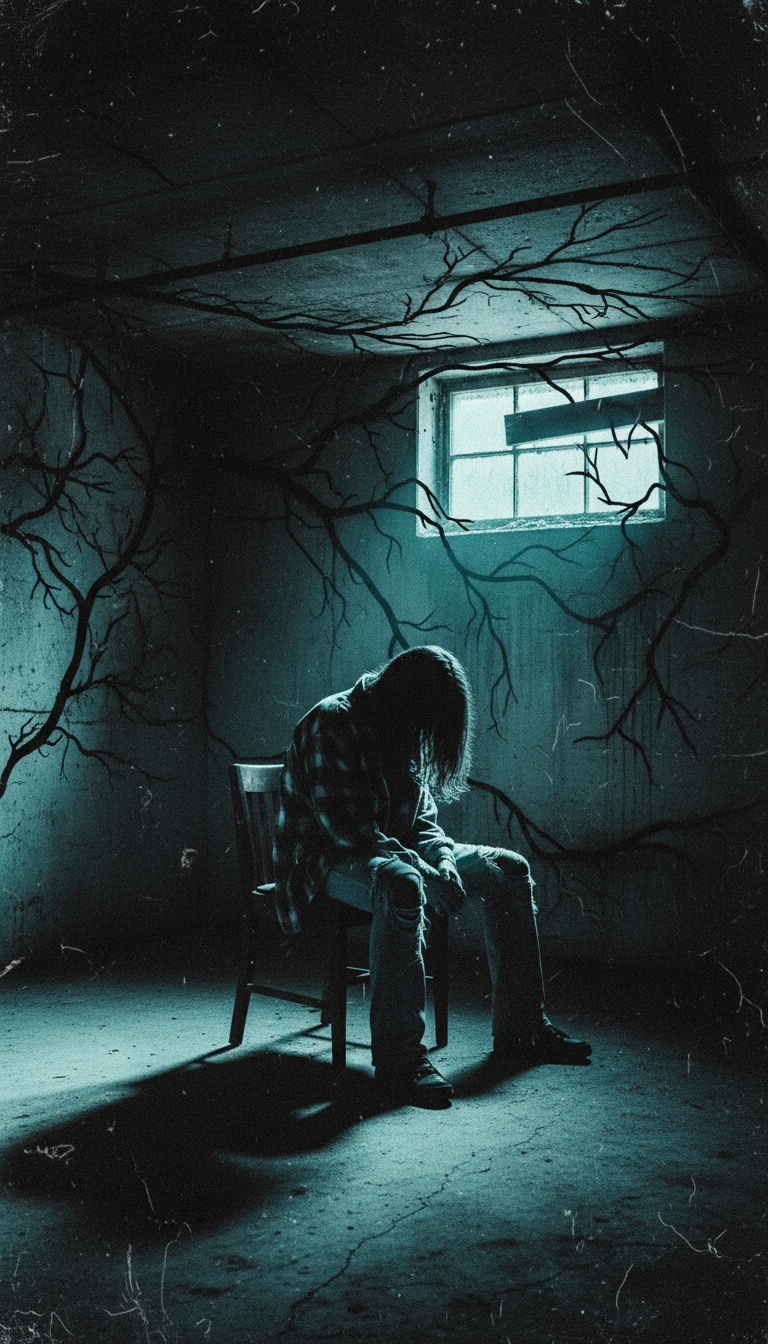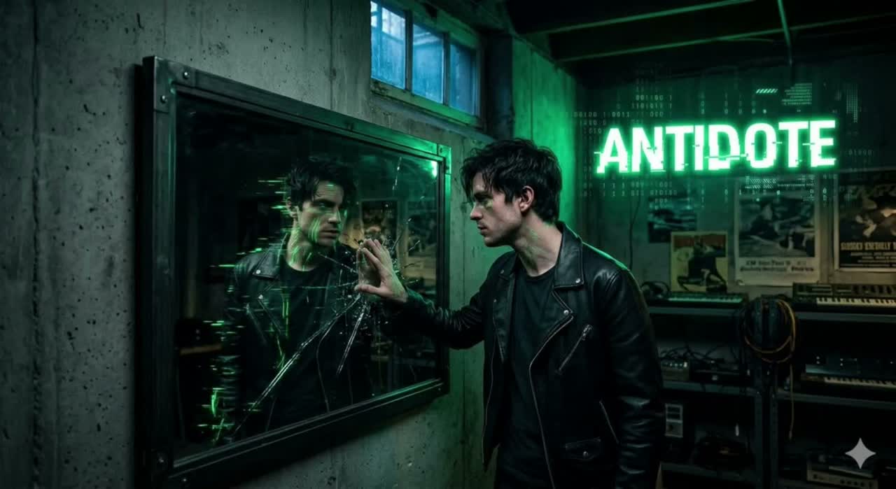 dark synth-pop, cinematic alt-pop, neo-80s, hyperpop undertones, electronic rock hybrid, atmospheric, melancholic, introspective, driving pulse, 2025 production, BPM 118, A minor, male lead vocal, raw and vulnerable, slight vocal fry on low notes, breathy verses, powerful belt on chorus, dual harmony backing vocals, choir swell on final chorus, spoken word in breakdown, sub-bass 808 sidechain, modulated Juno arpeggios, gated-reverb snare, orchestral string pads reverb-washed, distorted fuzz guitar mid-high, wide stereo field, glitchy vocal chops post-chorus, wall-of-sound final chorus, piano-only outro, Billie Eilish meets The Midnight meets Bring Me The Horizon Post Human era