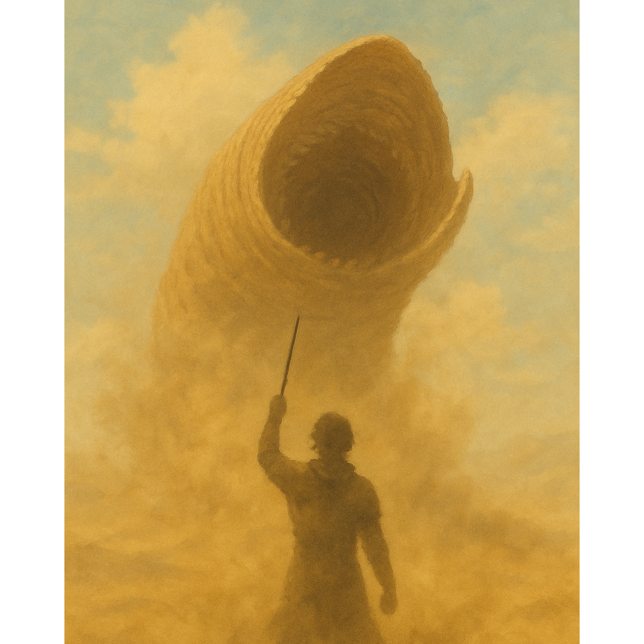 A dark, cinematic instrumental inspired by the deserts of Arrakis, Ethereal ambient layers, tribal percussion, ancient whispers in a fictional desert language, deep wind, and ritualistic humming, Sounds of sandstorms and footsteps blend with the voices of forgotten seers, Echoes of Shai-Hulud rumble beneath the dunes, Mysterious and sacred, like a prophecy unfolding under the twin moons