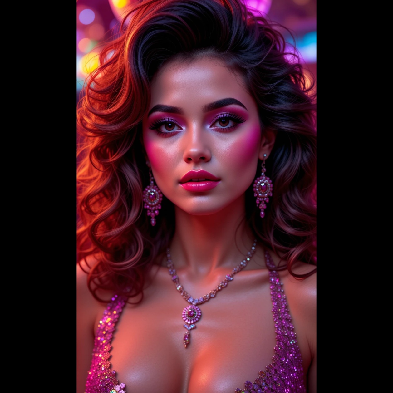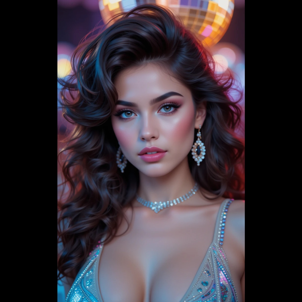 Female vocal in 80s disco-pop-rock style, Clear, expressive mezzo-soprano with bright timbre and smooth phrasing, Occasional emotional falsetto, precise articulation, light vibrato, confident yet sensitive tone, [Backing Vocals: layered harmonies in choruses, wide stereo, classic 80s shimmer] [Instrumentation: analog synths (Juno-60, DX7), rhythmic clean guitars, synth bass, electric piano, energetic disco-pop drums] [Drums: punchy electronic kick, tight gated snare, bright hi-hats, occasional tom fills] [Guitar: rhythmic funk-pop patterns with chorus/reverb FX] [Production FX: gated reverb, stereo chorus, tape delay, warm saturation] [Mood: romantic, nostalgic, empowering, danceable] [Mastering: ~ -7, 5 LUFS, polished retro mix with analog depth and stereo clarity]
