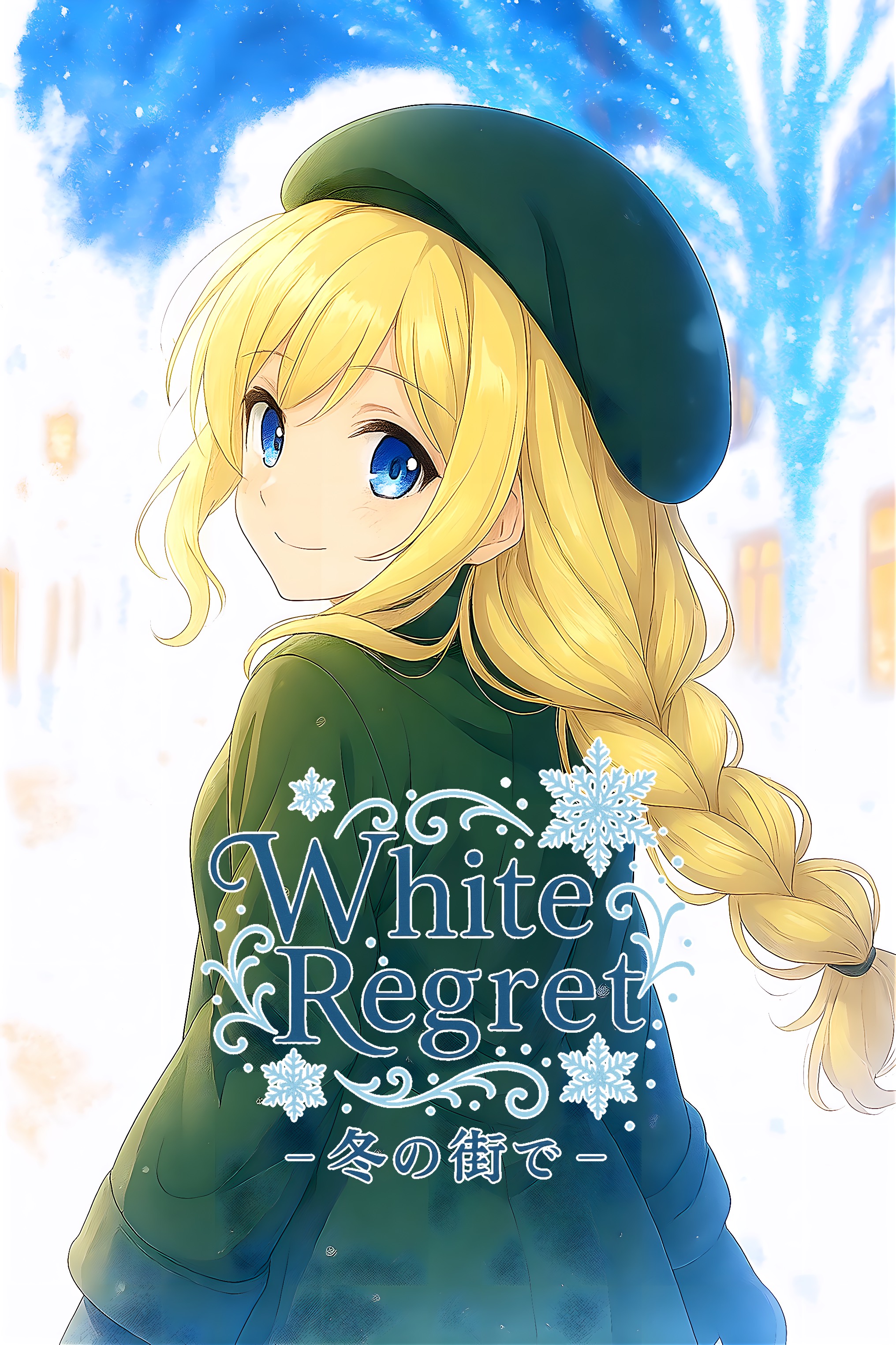Verse (4 lines, calm, snowy scenery) → Pre-Chorus (3 lines, rising tension) → Chorus (4 lines, emotional, melodic) → repeat with variation → Hook (4 lines, “White regret” motif) → Last Chorus & Final Chorus (unique lyrics, climax, deep and sorrowful), Focus on winter imagery, snow, white, frozen light, regret and memory, Song should have emotional depth, dramatic atmosphere, and the feel of a visual novel theme