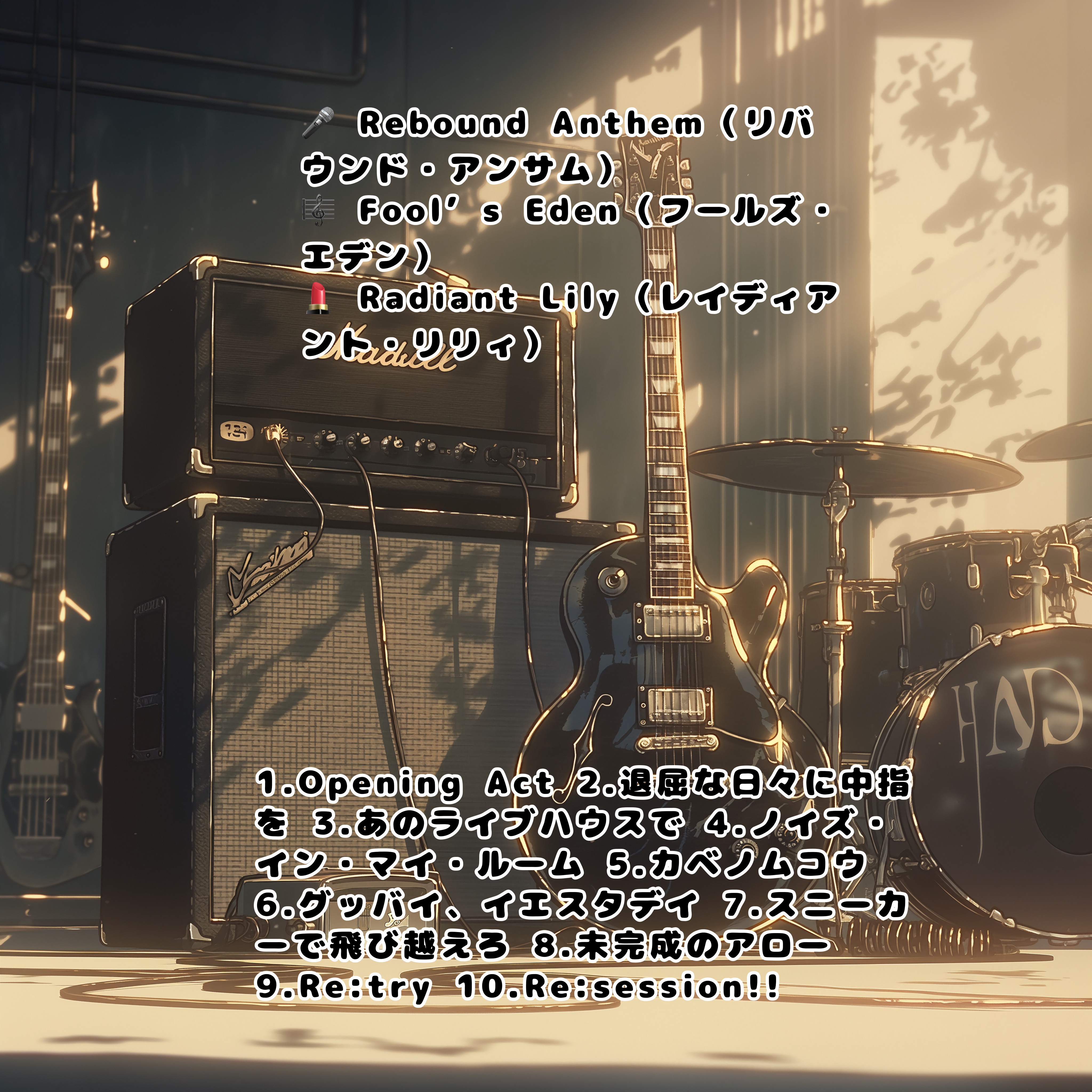 Male vocals, energetic and emotional J-Rock, Slightly husky mid-range tone with raw, heartfelt delivery, Inspired by real-life amateur bands, this song tells the story of a group men, bpm180, 4/4time