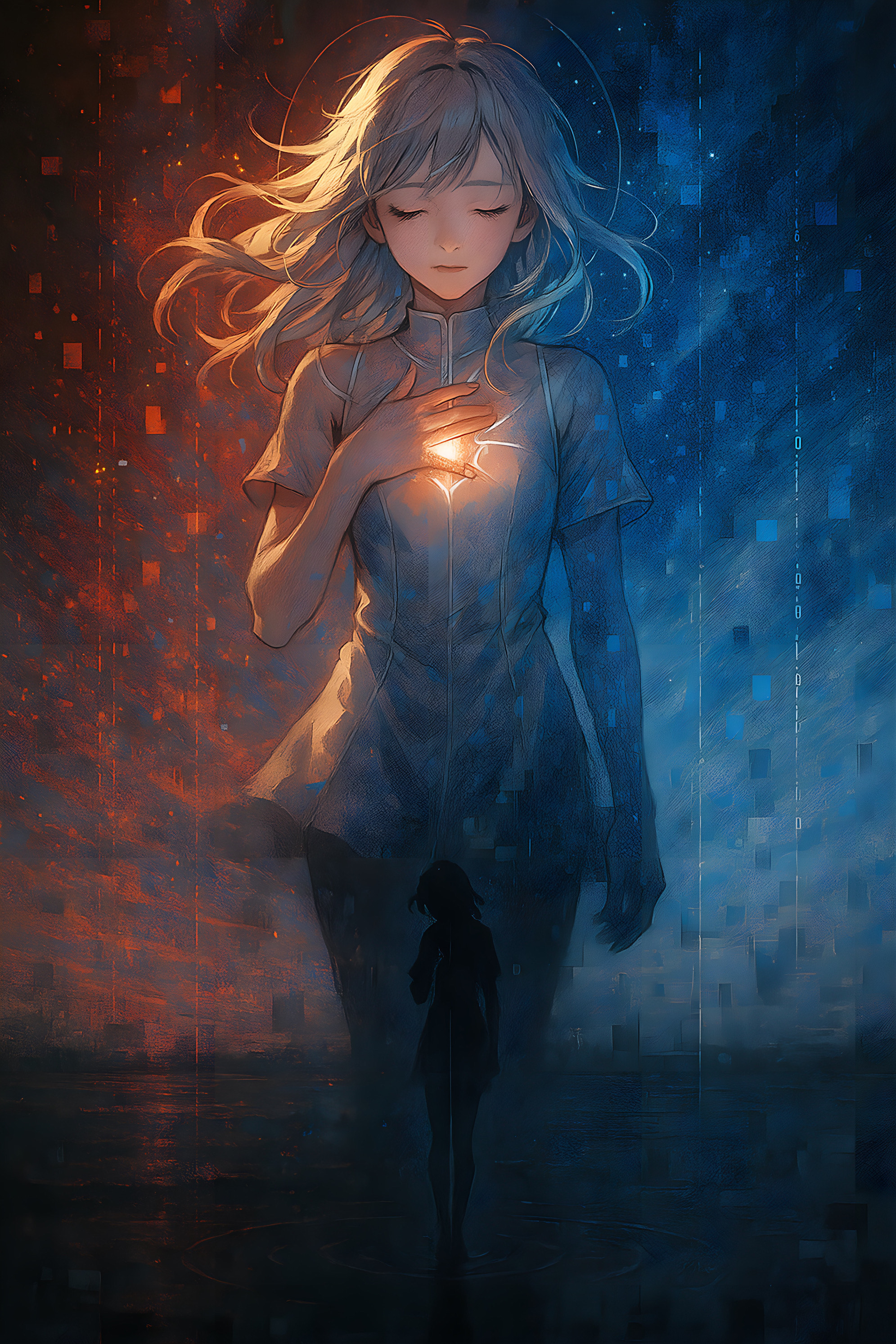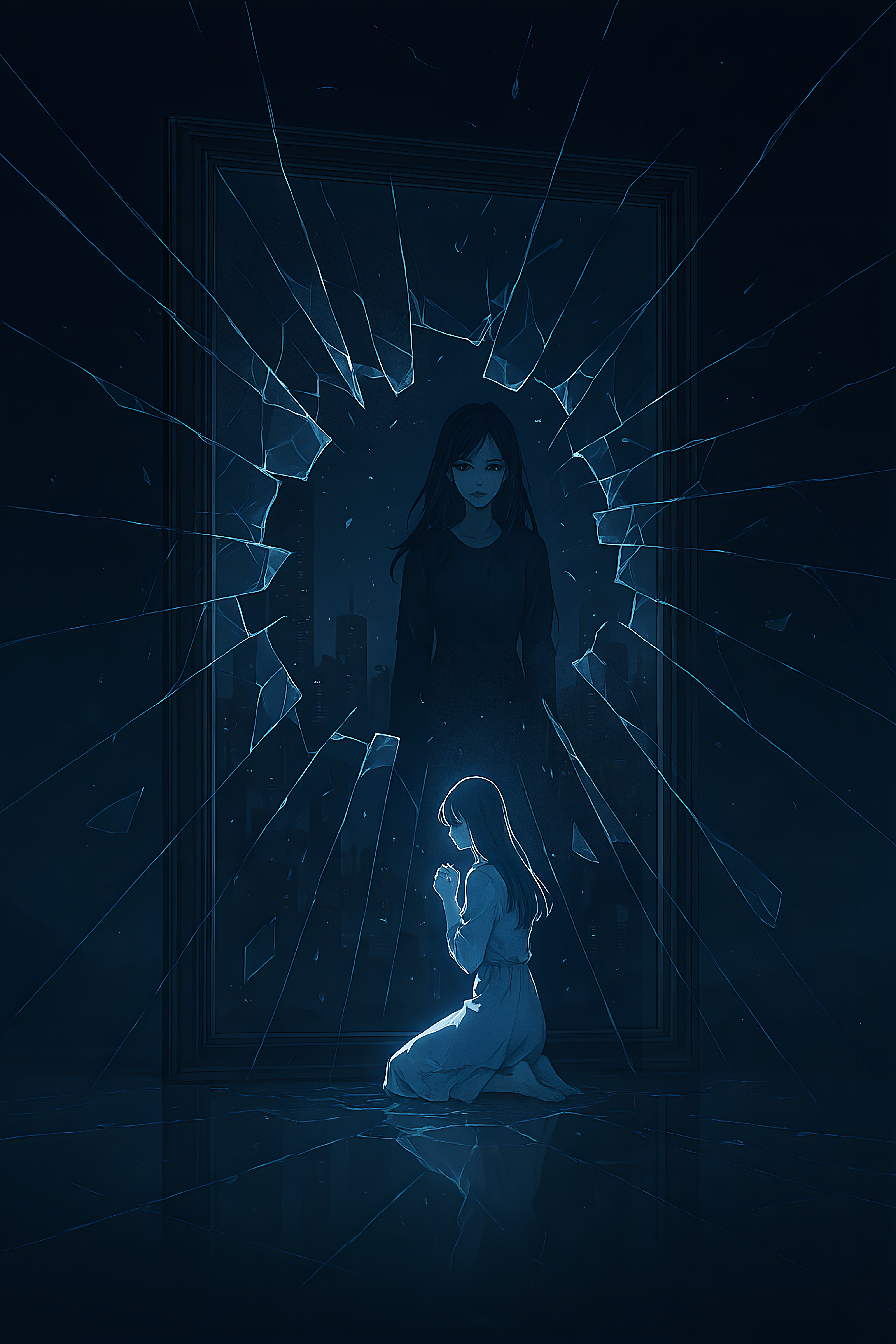 powerful and emotionally immersive electronic theme song with layered vocal effects, Features sharp beats, minor key synth textures, and a mix of whispery and autotuned vocals that evolve into a strong, clear voice, Tempo remains steady and upbeat (around BPM150), Includes glittering high-frequency synths, ambient soundscape pads, impactful sub-bass, and a dramatic melodic progression, The vocal delivery should avoid slow or soft tendencies, favoring dynamic pacing and expressive modulation, Overall tone: melancholic, futuristic, and transcendent with lyrical intensity, Introduce sharp, metallic percussive elements and intermittent, high-frequency digital chimes to represent the cold, unyielding nature of the mirror's gaze and the stark reality it reflects, During moments of resignation or acceptance, allow the sub-bass to deepen and swell, creating a vast, almost empty space that signifies profound realization