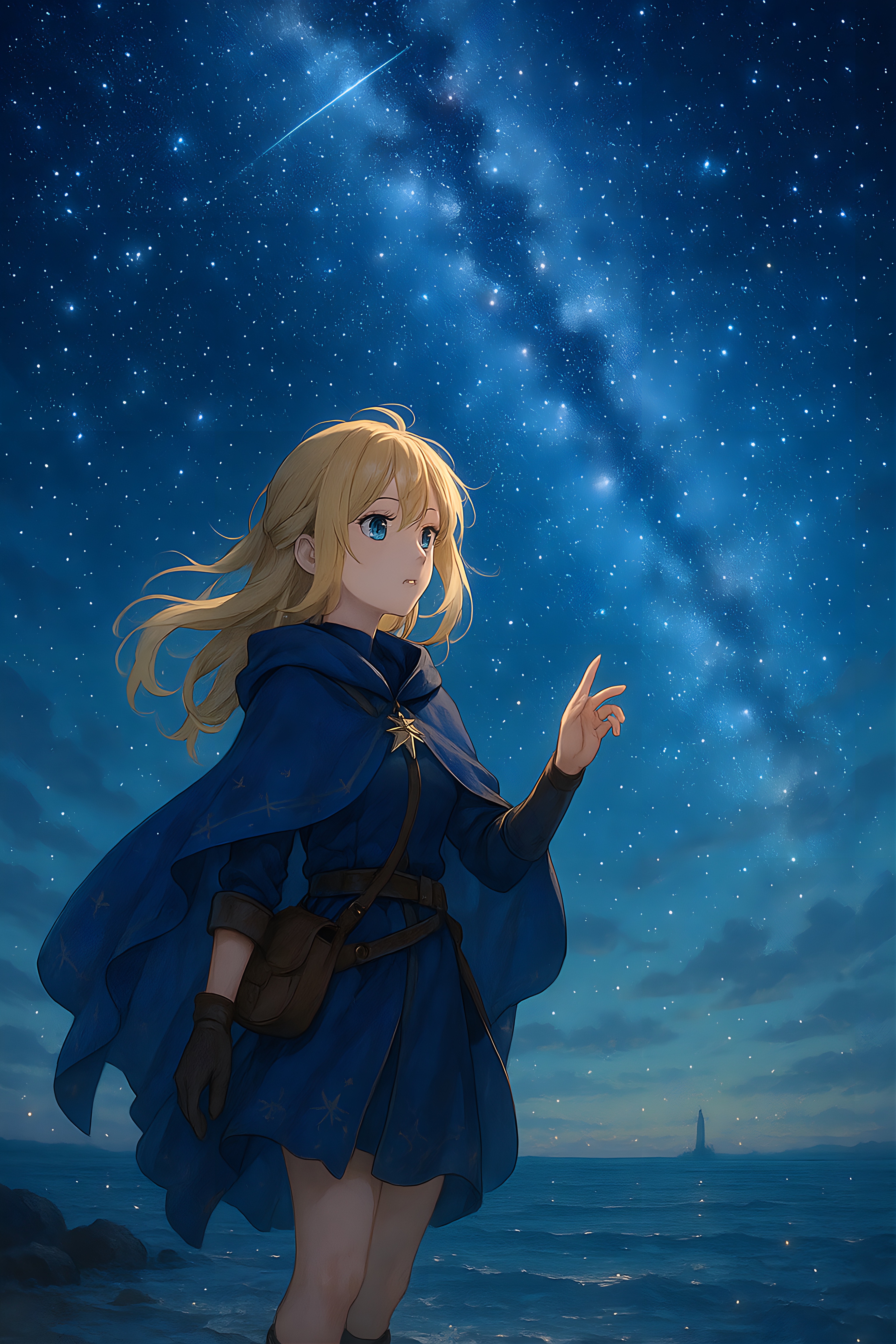 Anime-style emotional ballad with soft female vocals, BPM 130, 4/4 time, featuring piano, ambient synths, gentle strings and starlight-inspired melodies, Lyrics about stargazing, unspoken love, and qu