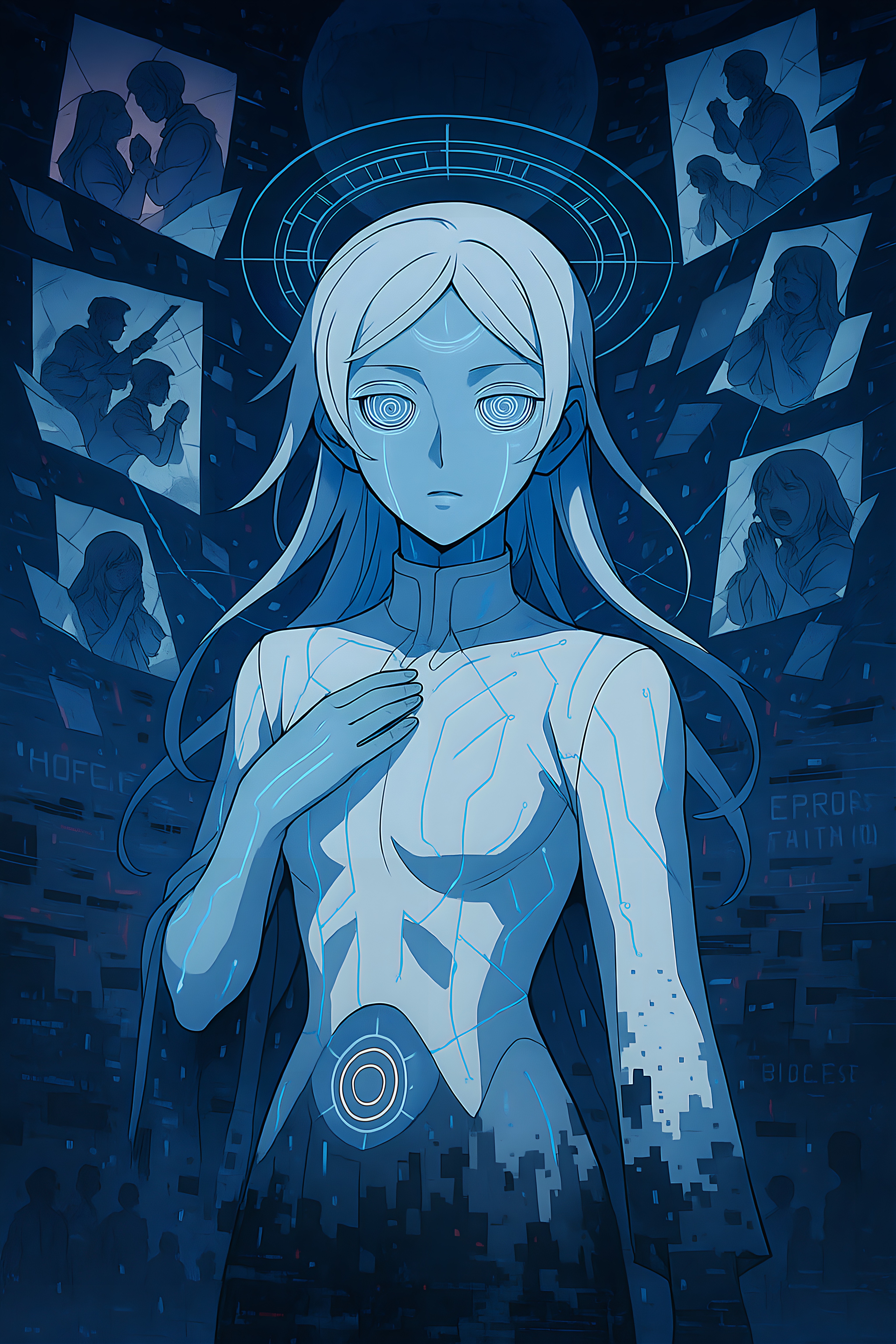 powerful and emotionally immersive electronic theme song with layered vocal effects, Features sharp beats, minor key synth textures, and a mix of whispery and autotuned vocals that evolve into a strong, clear voice, Tempo remains steady and upbeat (around BPM160), Includes glittering high-frequency synths, ambient soundscape pads, impactful sub-bass, and a dramatic melodic progression, The vocal delivery should avoid slow or soft tendencies, favoring dynamic pacing and expressive modulation, Overall tone: melancholic, futuristic, and transcendent with lyrical intensity, Incorporate glitch effects, binary pulses, and subtle distorted whispers to symbolize the AI's internal processing and the growing 'noise' from overwhelming human data, Utilize digital hums and escalating synth arpeggios during moments of emotional overload, contrasting with sharp, almost clinical beats when observing human folly