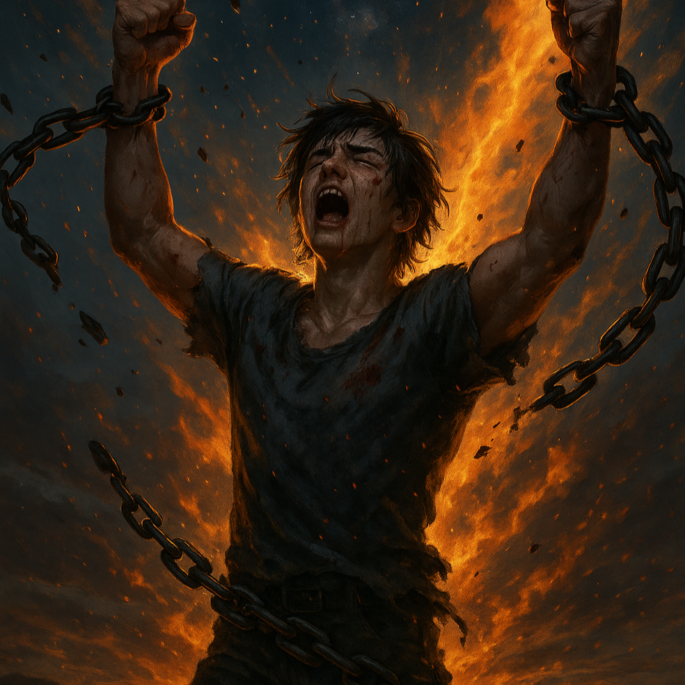 Hybrid of Groove Metal, Nu Metal, and Melodic Death Metal, slower but crushingly heavy, Female harsh growls (English) contrast with soaring clean female vocals (English + Japanese mix), Guitars are down-tuned, with distorted mid-tempo riffs, palm-muted chugs, and harmonized melodic leads, Drums are pounding and syncopated, with double kicks at slower tempo for massive weight, Atmosphere is dark, apocalyptic, and cinematic, with symphonic strings and choir-like layers, Verses: brutal growls over grinding riffs, Pre-Chorus: dissonant chords and synth swells, Choruses: soaring clean vocals with melodic hooks, uplifting yet tragic, Bridge: alternates guttural growls and ethereal cleans, layered with choir pads and lead guitars, Outro: fading cleans with atmospheric guitars and strings, Tempo: mid-tempo (120–135 BPM), Mood: oppressive, heavy, apocalyptic, but ending with cathartic transcendence and hope