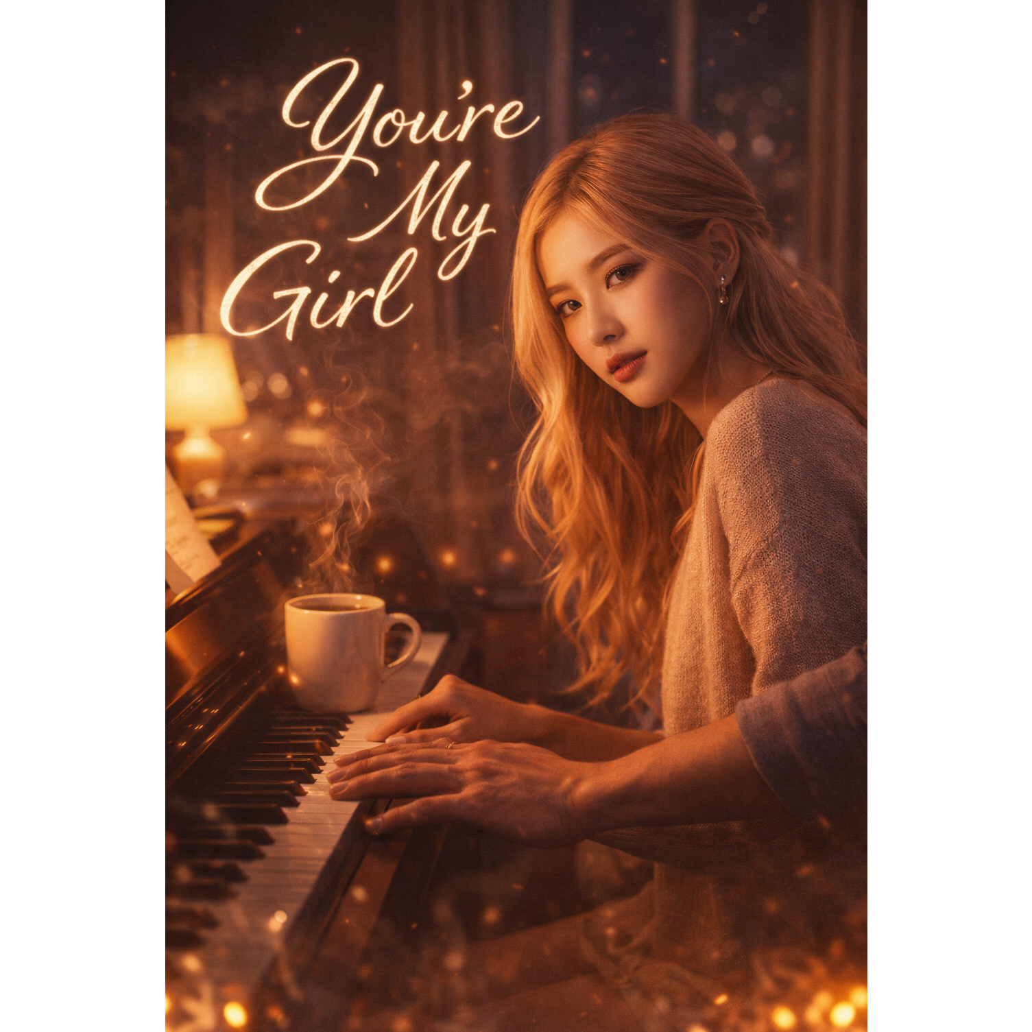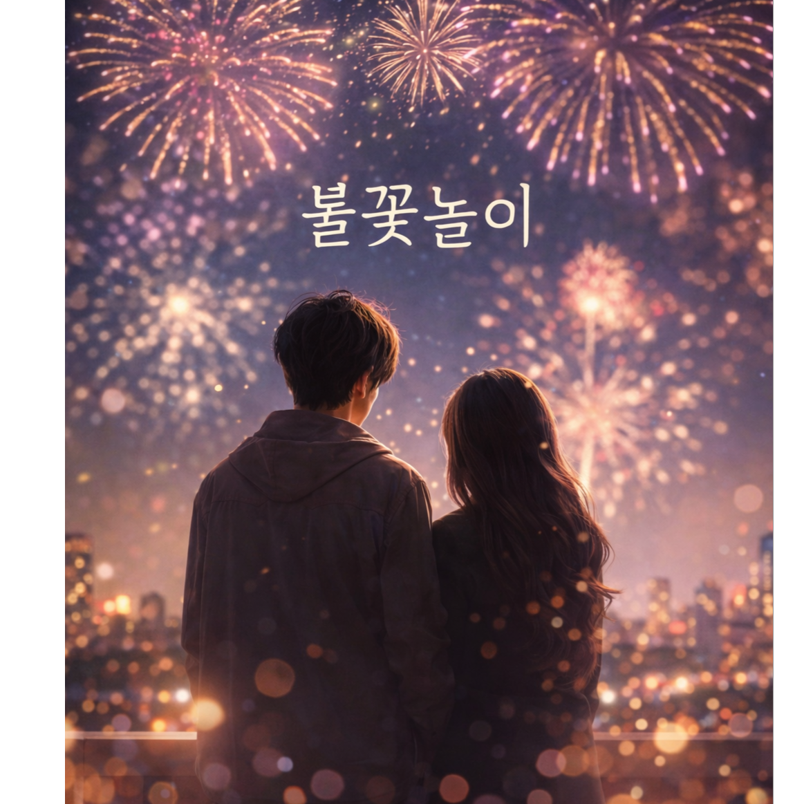 Modern K-pop / cinematic pop duet, intimate “one-take” live-room feel, Warm analog piano + soft guitar arps, sub-bass heartbeat, tight kick/snare, shimmering hats, airy pads, gentle strings lift in chorus, Emotional: tender, honest, midnight fireworks confession, Layered harmonies, close mic breath, subtle plate reverb, big but controlled final chorus, Korean/English blend, natural phrasing, Tempo 92 BPM, key D major (lift to E major final chorus), No comedy, no EDM drop
