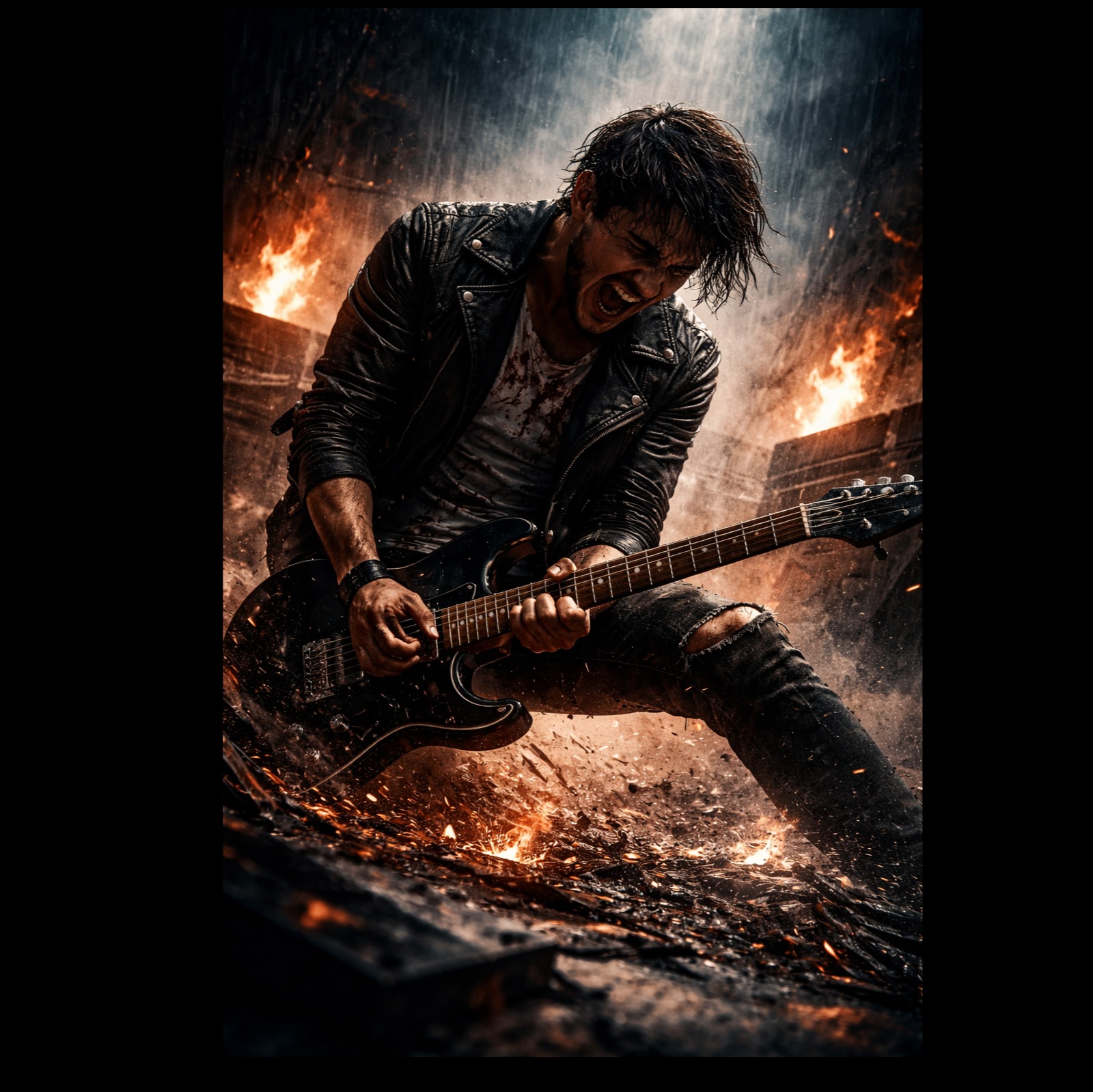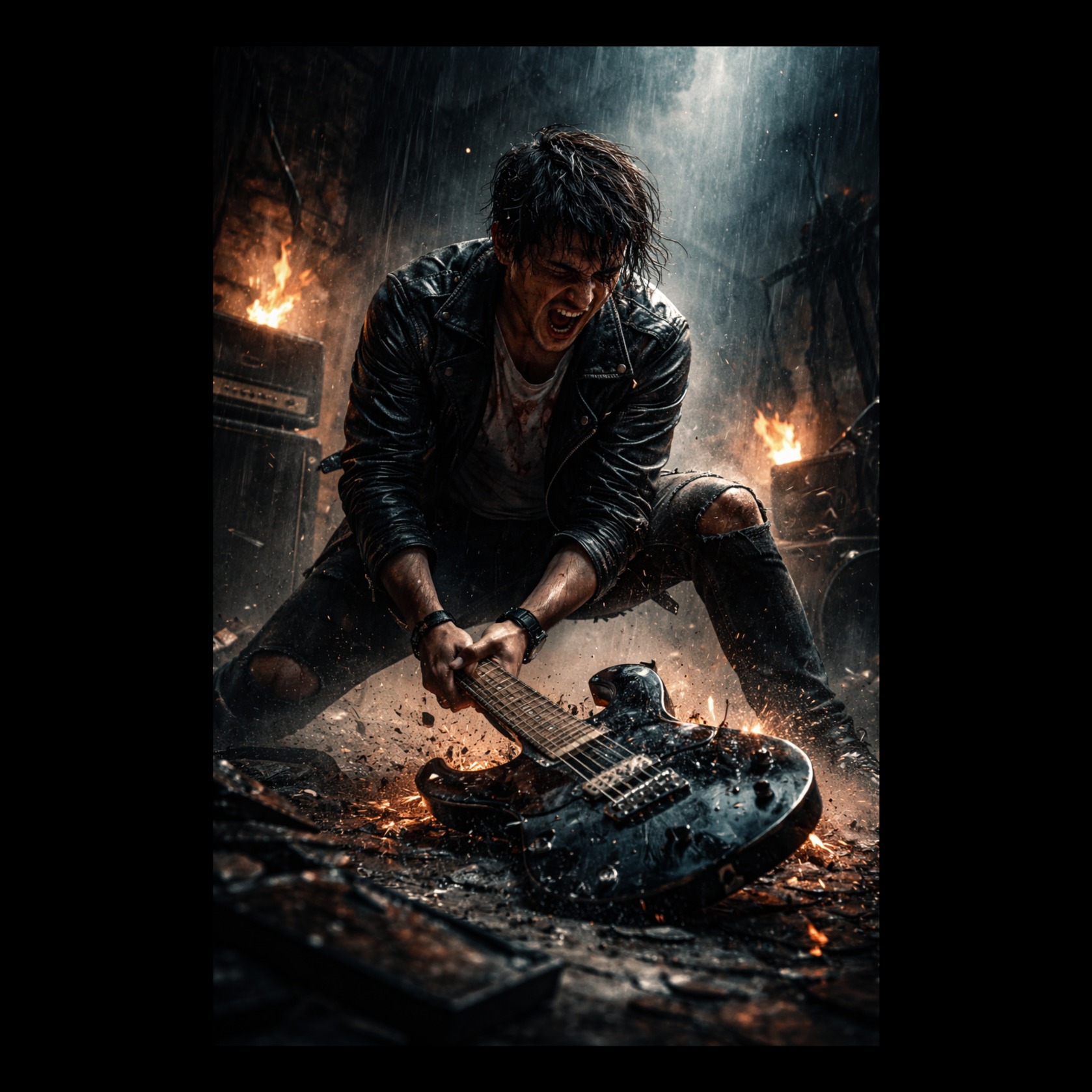 Instrumental only, no vocals, Heavy dark rock with aggressive distorted guitars, raw emotional energy, human imperfections, 95 BPM, Explosive structure: ambient intro → tension build → heavy guitar drop → aggressive riffs → breakdown → final massive climax, Guitars must feel like emotional screaming: powerful chords, bends, distortion, intensity, Strong drums, deep kick, punchy snare, Mood: anger, heartbreak, inner rage, emotional explosion, Wide, gritty, dynamic, cinematic, not clean