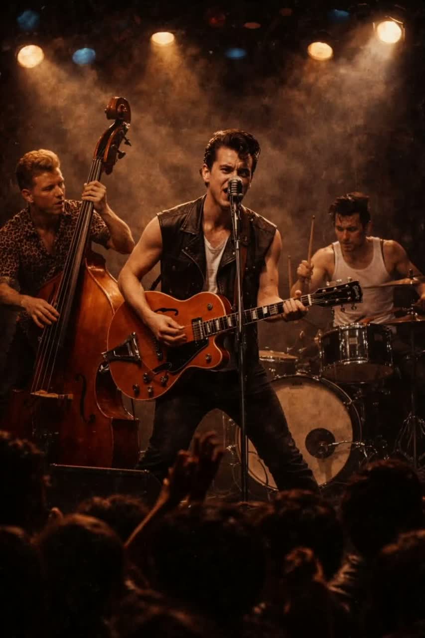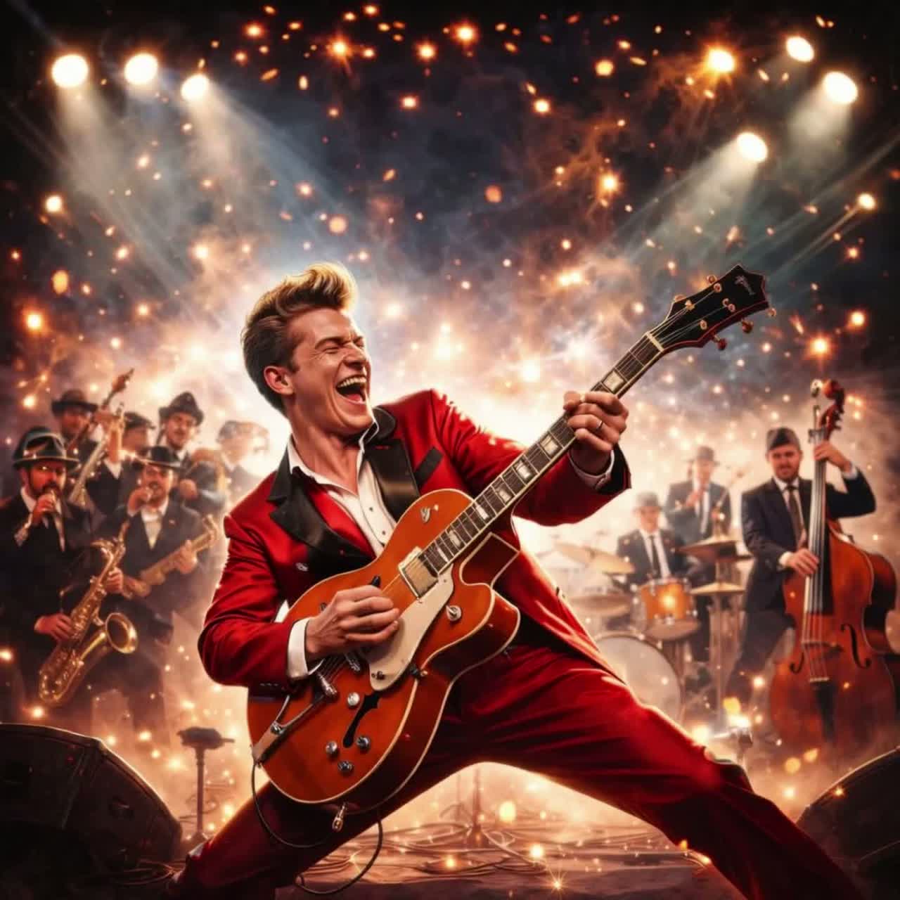 Bright, upbeat rockabilly song inspired by classic 80s rockabilly revival energy, Fast tempo around 180 BPM with strong slap-back echo electric guitar, walking upright bass feel, and lively swinging drums, Male vocal with joyful, confident, party-ready attitude, Extremely bright and energetic mood, focused on danceable groove, hand-clap moments, and singalong chorus, Guitar tone is clean, twangy, and sharp with playful riffs and rhythmic drive, Feel like a sweaty, fun live show where everyone is moving, Structure: intro, verses, big catchy chorus, simple bridge with crowd interaction, final chorus, energetic outro