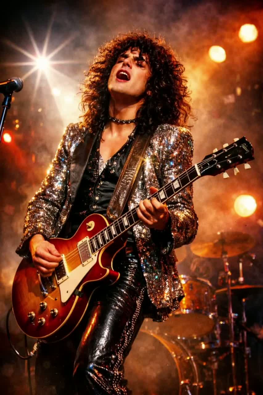 Catchy British glam rock song inspired by early 70s glam, Mid-tempo around 105–115 BPM with a simple, stomping rock groove, Drums are straightforward and driving, focusing on feel rather than precision, Bass is repetitive and hypnotic, supporting the groove with minimal movement, Electric guitar plays simple, fuzzy power-chord riffs and boogie-style patterns, but stays light, playful, and catchy rather than heavy or aggressive, Riffs should feel instantly memorable and loop-like, Male vocal is smooth, seductive, and playful with a slightly lazy delivery, Vocal melody is very catchy, sing-along, and almost nursery-rhyme simple, contrasting with the sexy, confident attitude, Lyrics focus on glam themes: rhythm, desire, movement, night, fantasy, and attitude, without complex storytelling, Overall mood is catchy, sexy, stylish, confident, and theatrical, celebrating glam rock’s sparkle, swagger, and pop sensibility