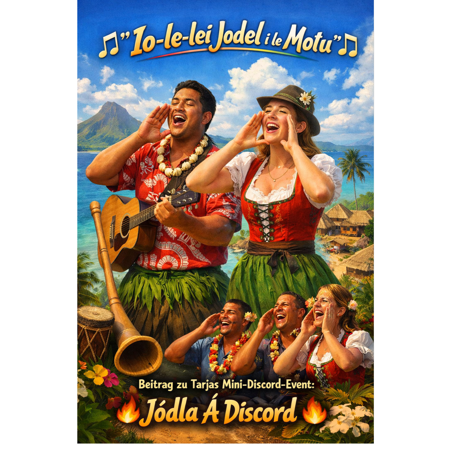 Intro: Begin with a free solo yodel and soft alphorn-pad, Verse: Minimal hand drum groove, ukulele rhythms, storytelling vocals with agile yodel fills, Pre-Chorus: Layers of shaker and percussion rise, upping dance energy, Chorus: Infectious yodel hook, big call-&-response, crowd-pleasing, with pulsing acoustic guitar, Post-Chorus: Percussive yodel-phrase looped over party groove for dancefloor effect, Verse 2: Richer textures; men’s and women’s choir answer phrases for humor, Bridge: Beat drops out, interactive call-&-response, crowd claps and vocal shout-backs, Final Chorus: Full chorus in higher key (modulation to A), wide harmonies, driving party energy, Outro: Fading yodel motif, capped by one last solo yodel shout, Texturally: Bright pads, playful hand percussion, folksy strings