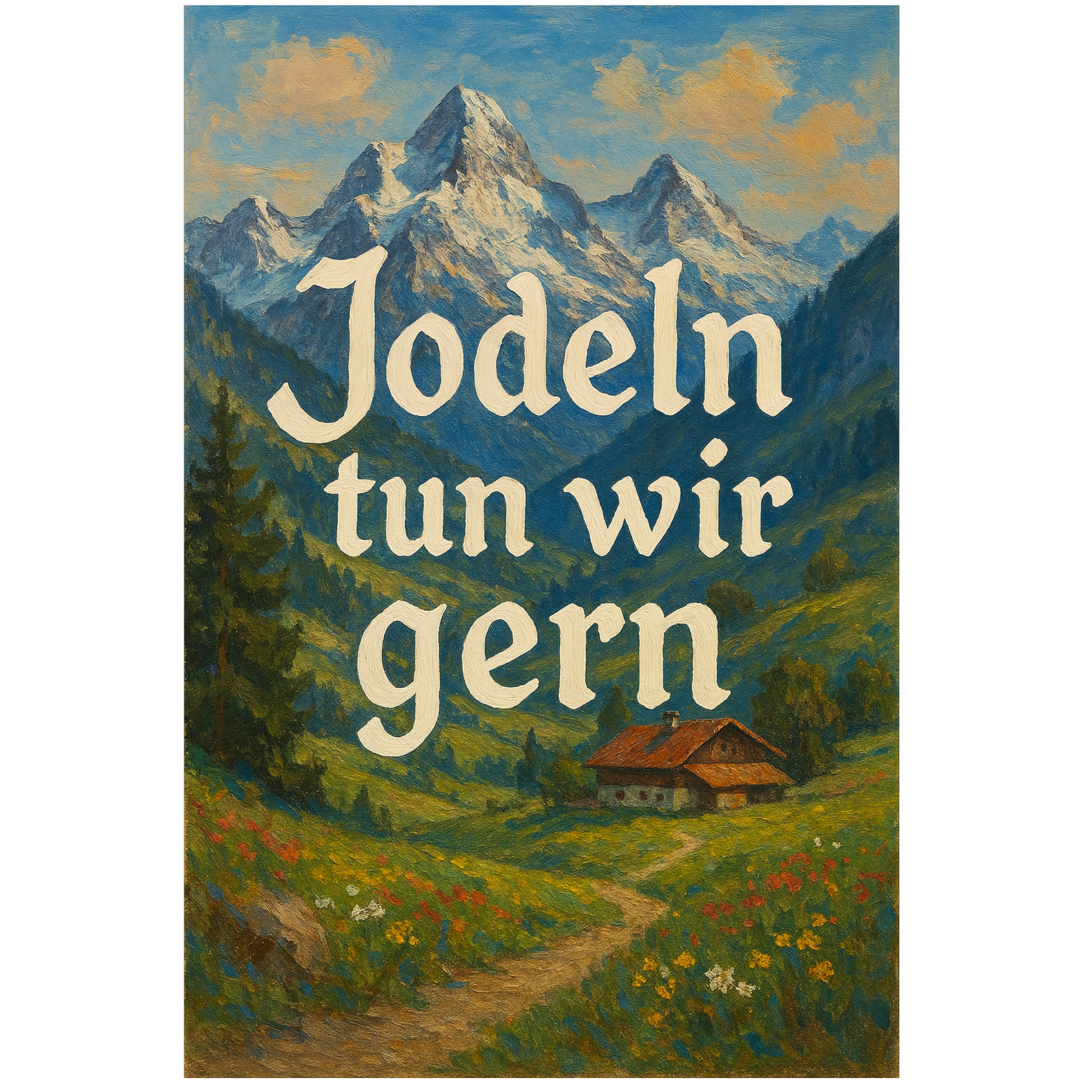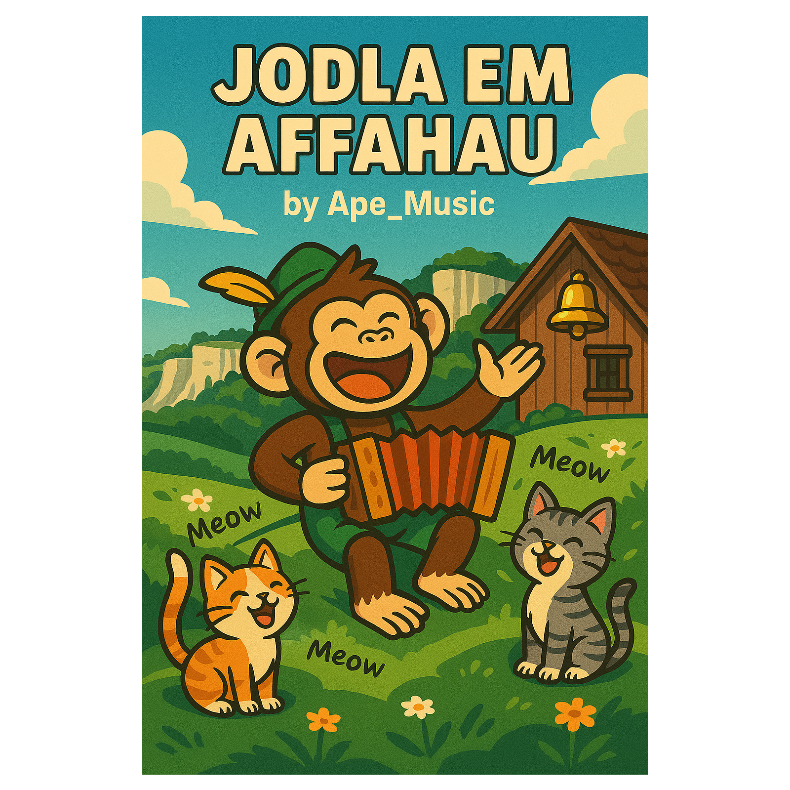 Schwäbischer Alpenjodel, lustig, Akkordeon, Kuhglocken, Alpenchor, schneller Takt, Traditioneller Alpenjodel + Comedy Folk, helle Stimmen, viel Hall, Bergwiesen‑Vibe