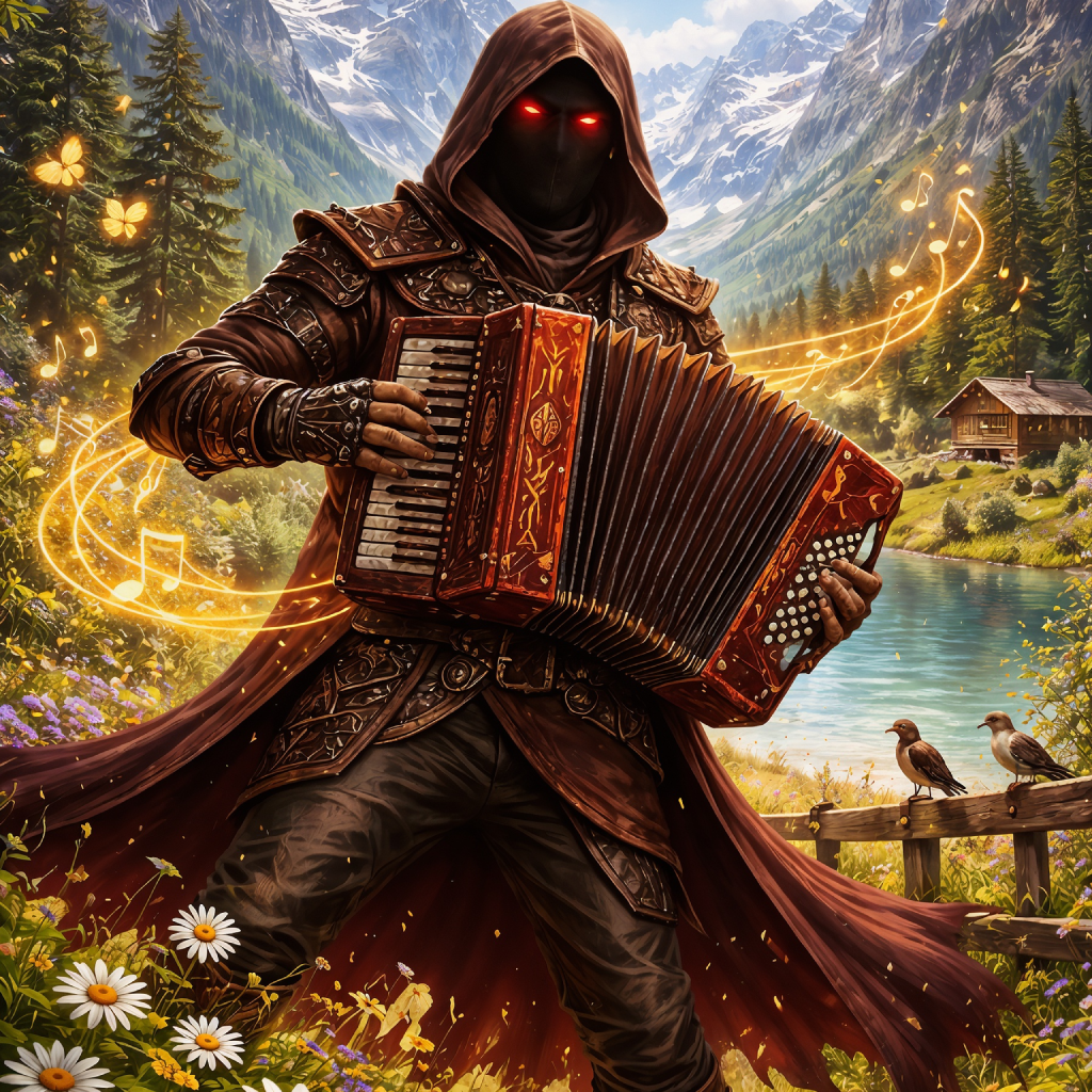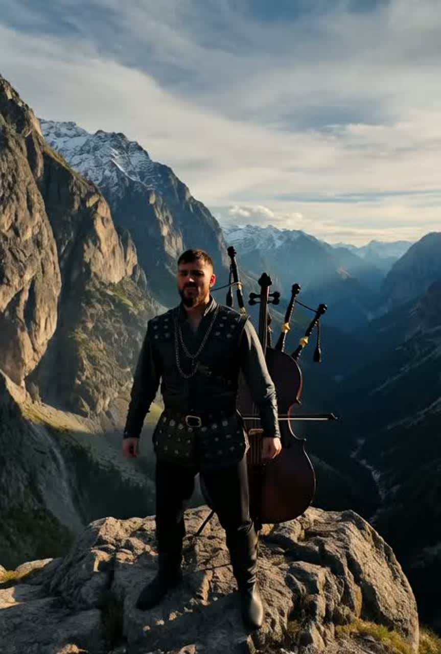 Folk-Metal Cover of Tarja's "Jódla Á Discord" with original lyrics and preserved yodel melody, Tempo 6/8 at 96 bpm, key E minor, Voxaris male lirico-spinto tenor lead, theatrical phrasing and metal edge, Yodel phrases match original melody and rhythm but alternate with deeper, darker lyrics, Instrumentation: distorted tagelharpa and cello (warm but gritty), low bagpipes drone as main ostinato, war toms, metallic shakers, foot stomps, layered harmonics with ambient noise, Texture: dramatic, ritualistic, folk-metal blend, No fade, Clip Volume +4