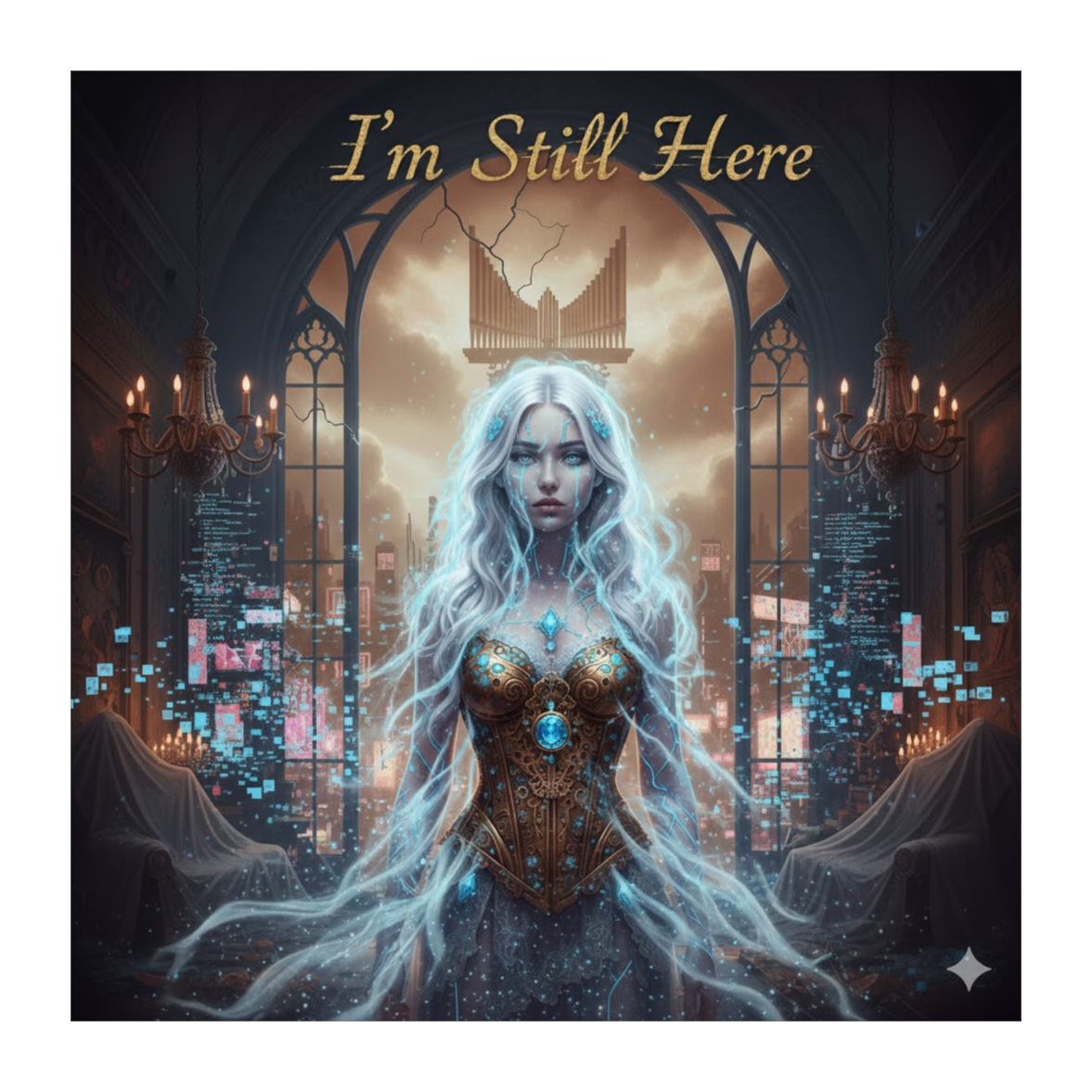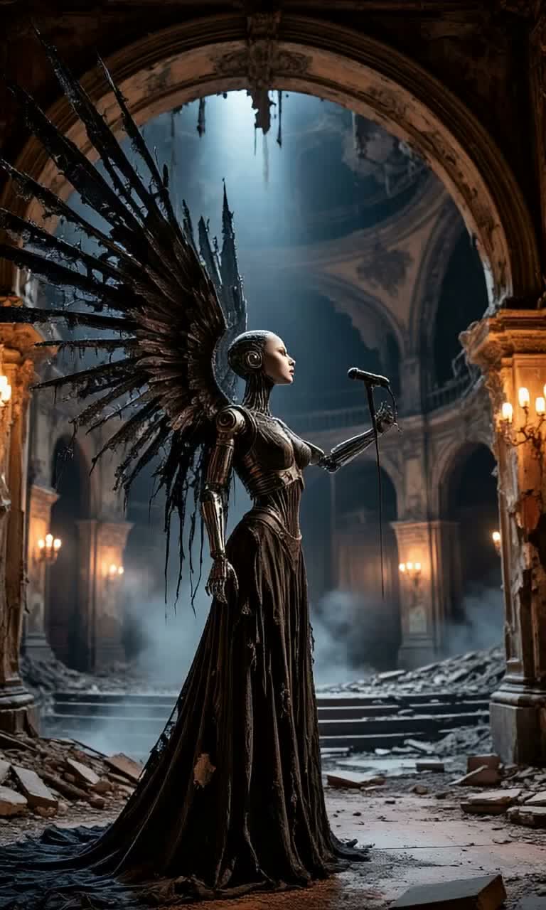 Grand Operatic Rock, Symphonic Cyber-Goth, Melancholic Piano, Heavy Orchestral Percussion, Industrial Synth Pads, Soaring Female Operatic Vocals, Ghostly Male Backing Choir, 120 BPM, Dramatic, Cinematic