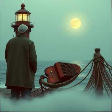 Compose a slow, poetic acoustic melody for a song about maritime heritage [héritage marin] and identity [racines], Use only guitar and accordion, minor and major chord shifts, slightly raspy voice [voix légèrement éraillée], flowing verses with tender melodic rises, powerful and warm choruses, reflective and intimate phrasing, pauses for breath on key words [large, rivage, héritage], cinematic and melancholic yet luminous atmosphere