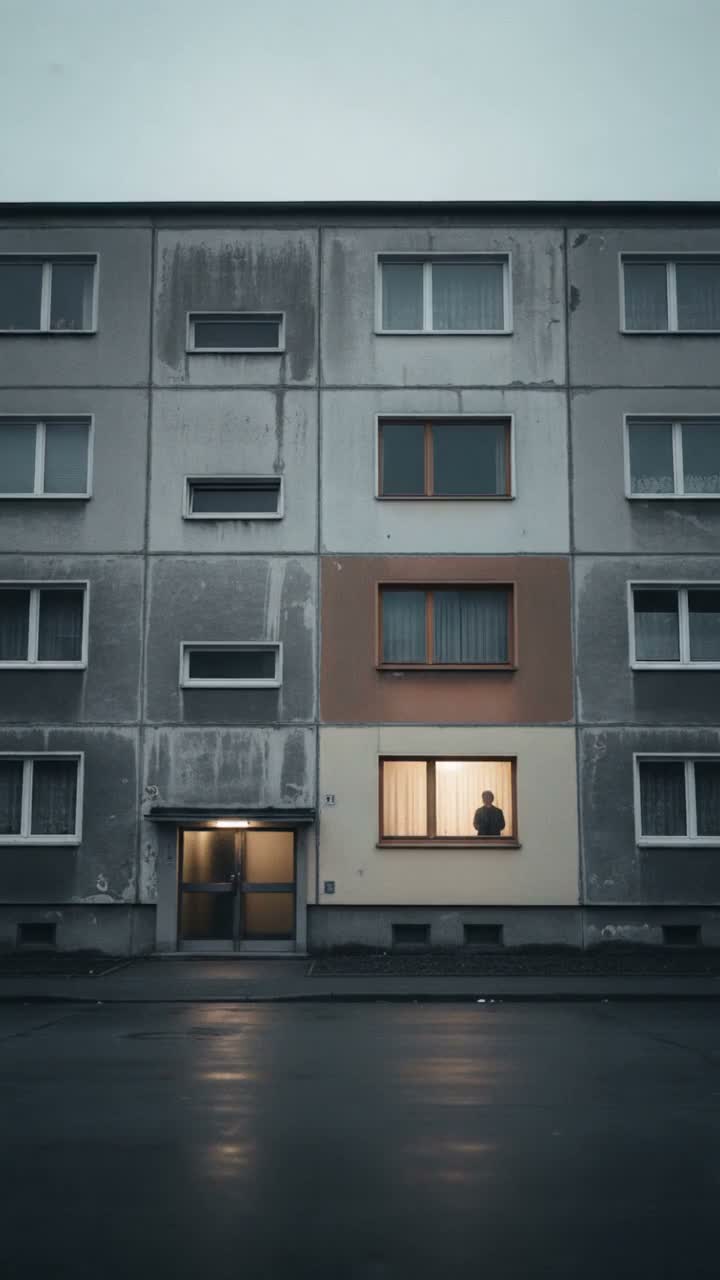 Darkwave gothic duet, deep male baritone vocals and soft melancholic female vocals, emotional call-and-response structure symbolizing two souls, slow tempo around 75 BPM, atmospheric analog synth pads, vintage drum machine with deep gated snare, pulsing dark bassline, minimal piano accents, ethereal female harmonies floating above the mix, melancholic and introspective mood, cinematic gothic atmosphere, influences of classic darkwave and modern dark pop, haunting reverb-heavy vocals, intimate verses alternating male and female, powerful layered duet chorus, themes of existential routine, inner dialogue and duality of the soul, nocturnal soundscape, dramatic final chorus with lush synths and fading ambient textures