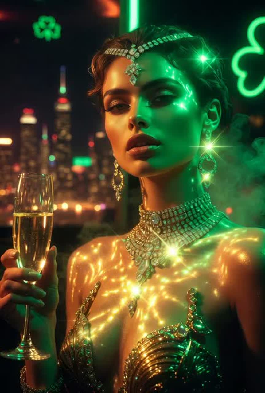 Irish EDM fusion club anthem for St, Patrick’s Day, High-energy track blending traditional Irish folk elements (tin whistle, fiddle, Celtic flute, bodhrán-style percussion) with modern EDM and bass house production, Strong female vocal with confident, playful “lucky rich” attitude, chant-style hooks and rhythmic delivery, Heavy kicks, deep bass, festival synths, risers and powerful drops, Mood: festive, wild, lucky, luxurious, party energy with Celtic flair, Tempo 126–130 BPM, key D minor or G minor, Structure: intro with Irish instruments → short rhythmic verse → build-up with flute lead → big chant chorus → drop with bass + fiddle → verse → build-up → anthem chorus → bridge with Celtic break → final festival drop → outro chant, Keywords: St, Patrick’s Day, Irish dance fusion, Celtic EDM, club banger, chant hooks, festival vibe