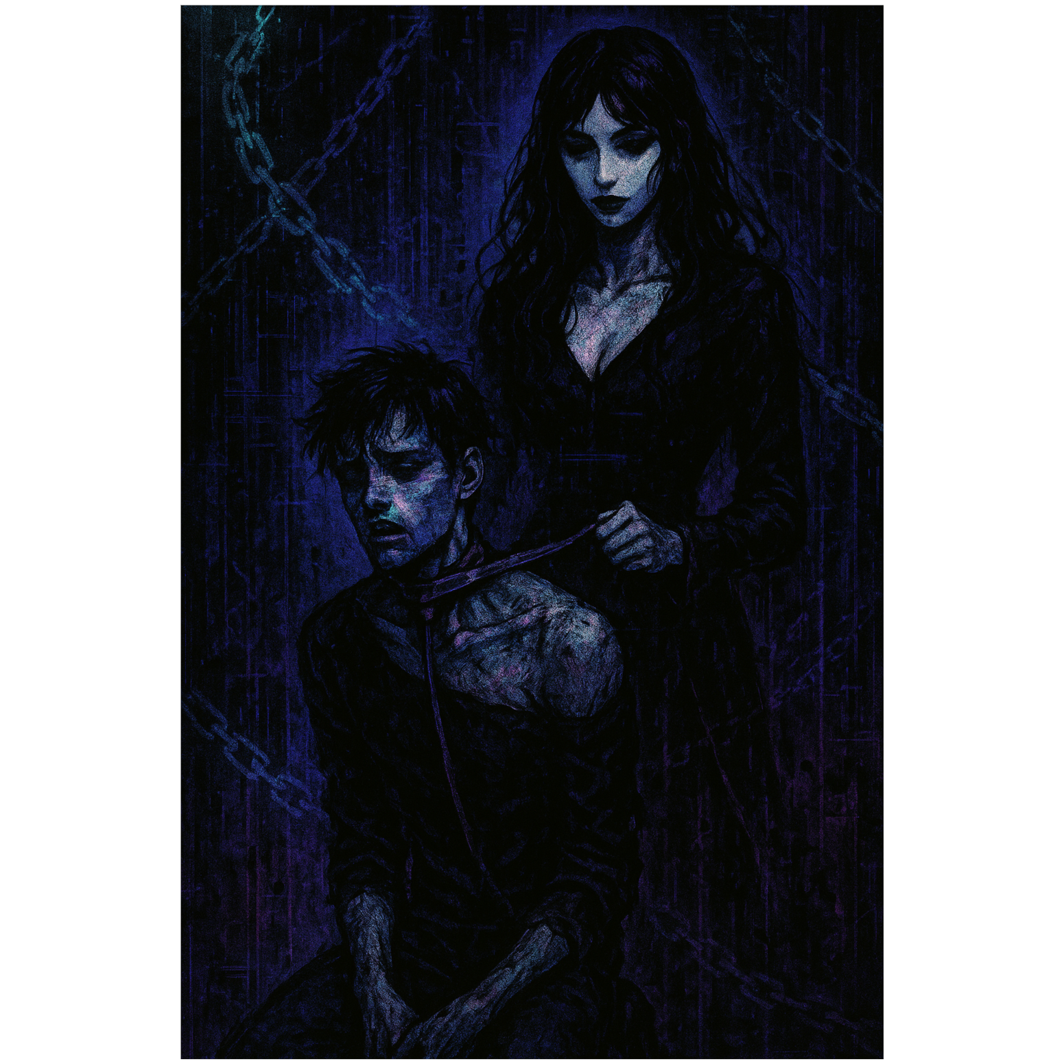 A dark and heavy Japanese visual kei-inspired orchestral rock song with glitch elements, featuring distorted strings, brooding brass, dramatic timpani, deep orchestral percussion, and glitchy electronic textures, Unsettling sound effects such as whispers, chains rattling, reversed audio glitches, stuttering string and brass phrases, and eerie electronic noises are integrated into the orchestral arrangement, The vocal style alternates between intense, expressive screams and hauntingly melodic clean singing with abstract and poetic lyrics, The mood is intense, mysterious, and cinematic, evoking feelings of obsession, madness, and despair, The song structure includes an ominous orchestral intro with slowly building tension and glitchy accents, explosive choruses with full orchestral and distorted electronic power, a chilling bridge with sparse instrumentation and isolated glitch sounds, and a gradual noisy, dissonant orchestral outro, No artist names included