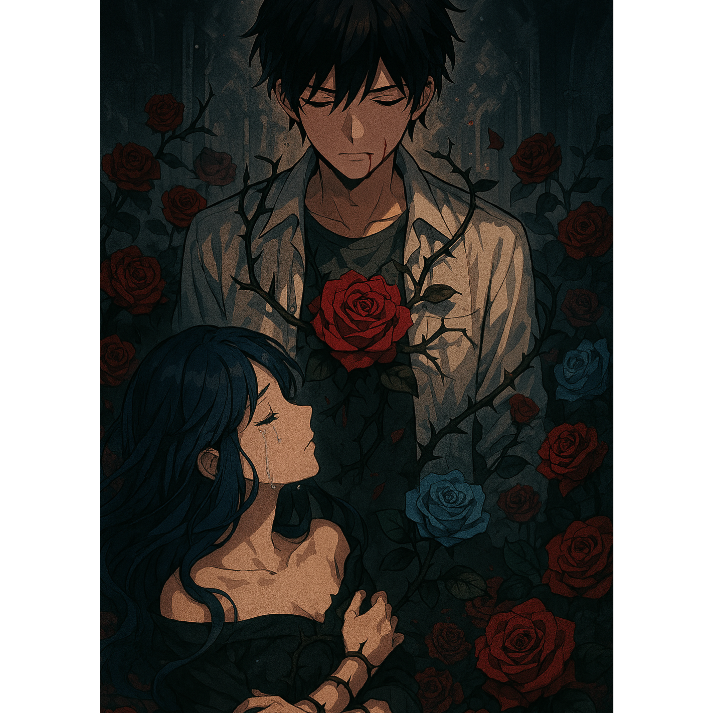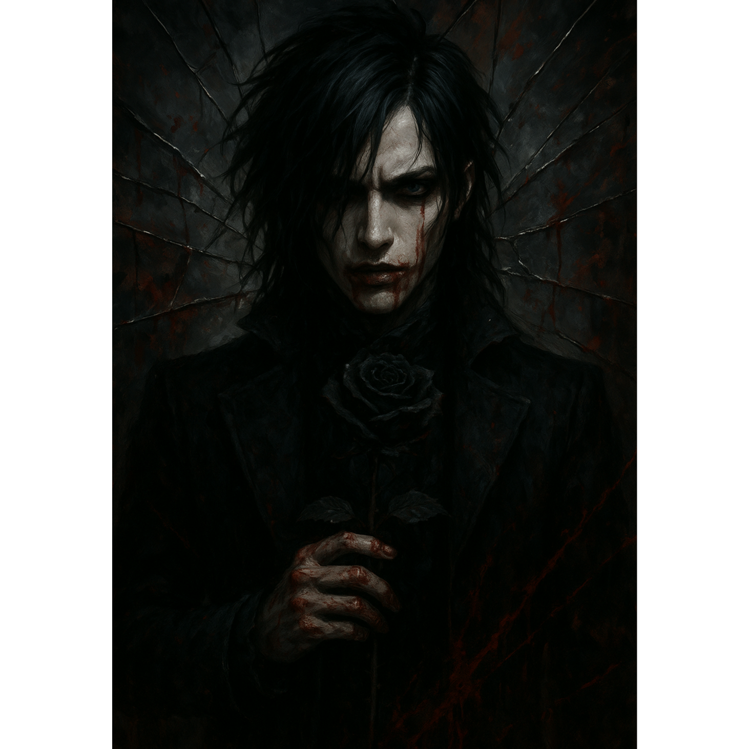 Create a Visual Kei inspired heavy rock/metal track with a dark, aggressive, and destructive atmosphere, The song should blend melodic yet furious energy, combining distorted twin guitar riffs, deep bass lines, and relentless double kick drumming, Add occasional breakdowns with half-tempo crushing riffs, and insert sudden silence or eerie piano/strings passages for dramatic tension, Vocals should mix clean melodic singing with restrained harsh shouts and whispered phrases, emphasizing jealousy, madness, and destructive love, The chorus must be emotional, melodic, and powerful, while verses are more tense, spoken or snarled, Include a chaotic guitar solo section leading back into an explosive final chorus with faster tempo and a climactic ending that cuts abruptly into noise, Overall mood: theatrical, brutal yet melodic, modern Visual Kei meets death-inspired metalcore