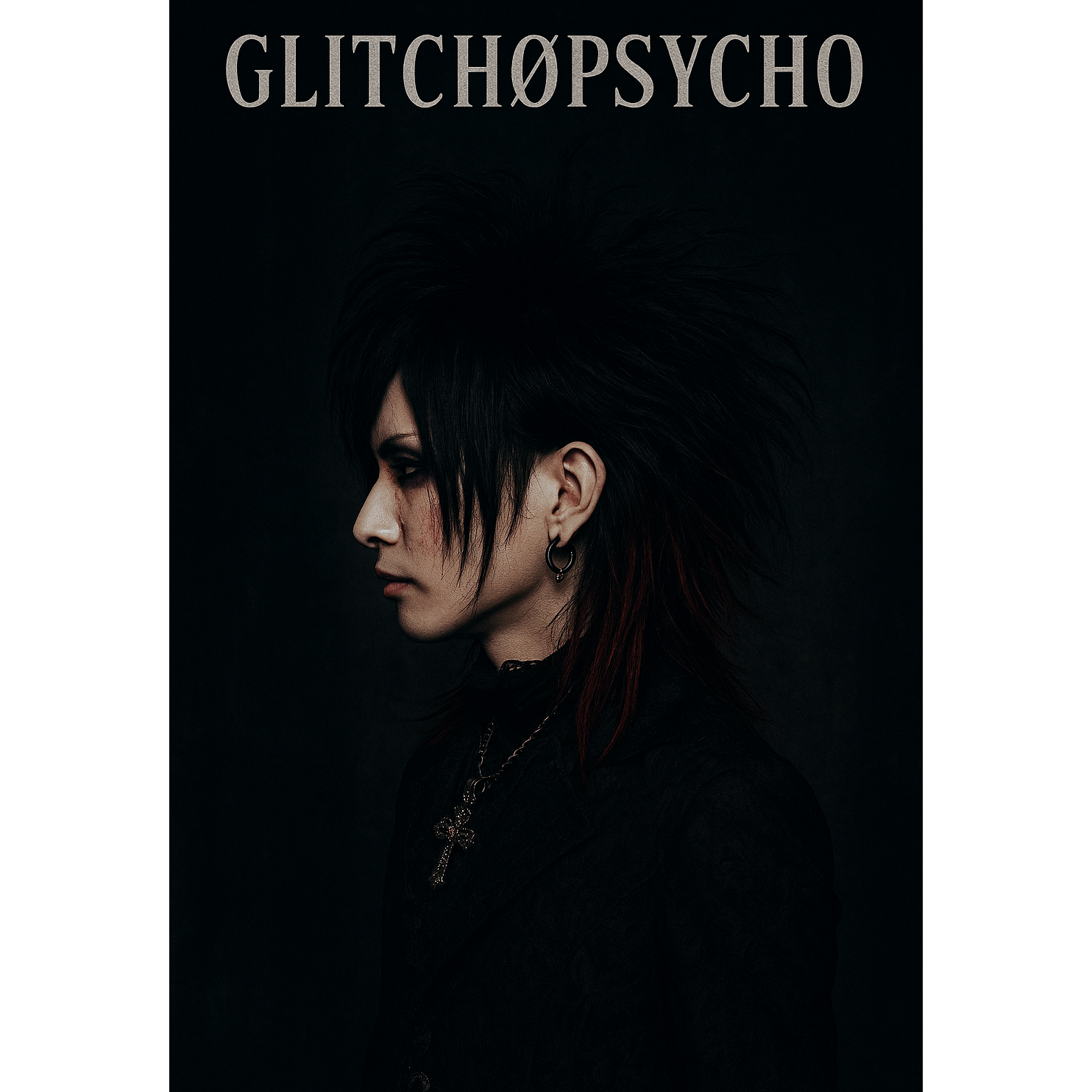 A Glitch, dark and heavy Japanese visual kei rock song with distorted guitars, aggressive drums, and deep bass, The song features unsettling sound effects such as whispers, chains rattling, reversed audio glitches, and eerie electronic noises, The vocal style alternates between harsh screams and haunting clean singing with abstract and poetic lyrics, The mood is intense, mysterious, and atmospheric, evoking feelings of obsession, madness, and despair, The song structure includes an ominous intro, explosive choruses, a chilling bridge with sparse instrumentation, and a gradual noisy outro, No artist names included