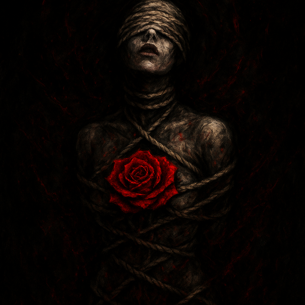 A dark and glitch and heavy Japanese visual kei rock song with distorted guitars, aggressive drums, and deep bass, The song features unsettling sound effects such as whispers, chains rattling, reversed audio glitches, and eerie electronic noises, The vocal style alternates between harsh screams and haunting clean singing with abstract and poetic lyrics, The mood is intense, mysterious, and atmospheric, evoking feelings of obsession, madness, and despair, The song structure includes an ominous intro, explosive choruses, a chilling bridge with sparse instrumentation, and a gradual noisy outro, No artist names included