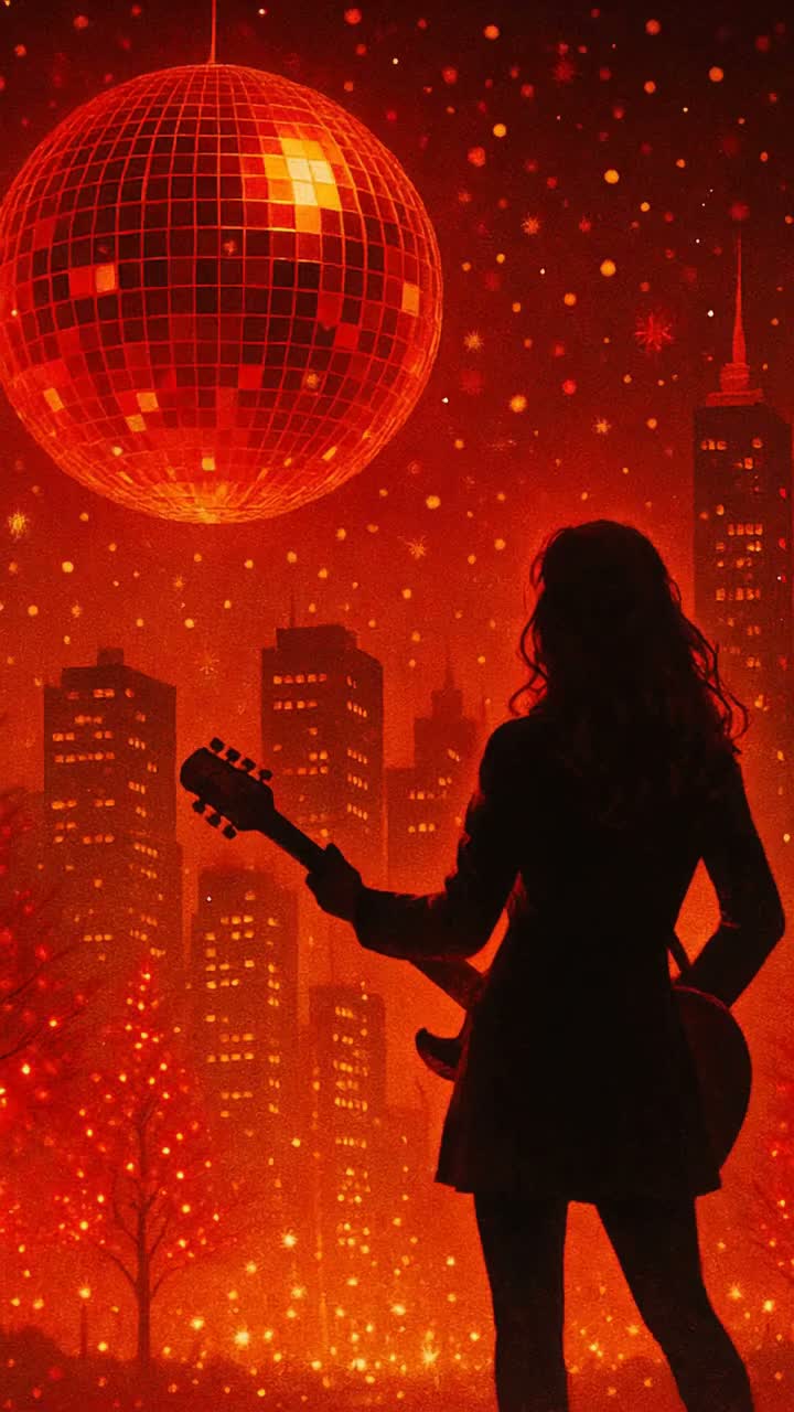 Crunchy 16th-note rhythm stabs, bold repeating riffs like a disco mantra, short octave runs and icy bends for sparkle, Guitar must be forward in the mix — gritty, festive, unapologetic, Add strong Christmas coloration:
