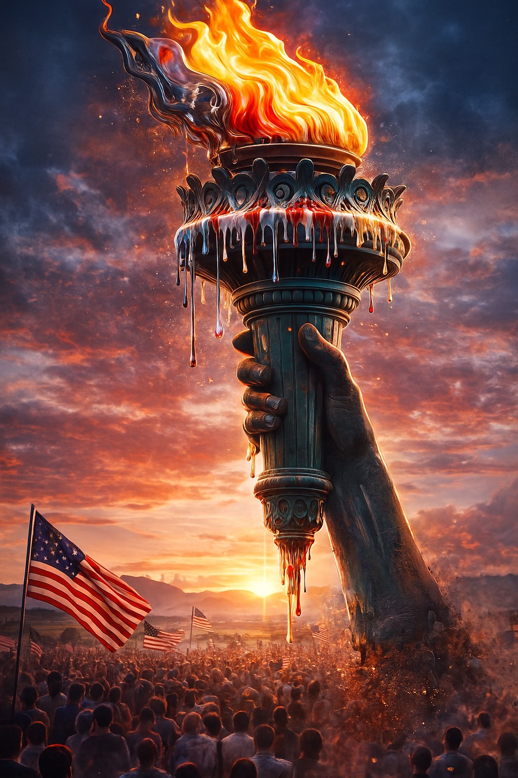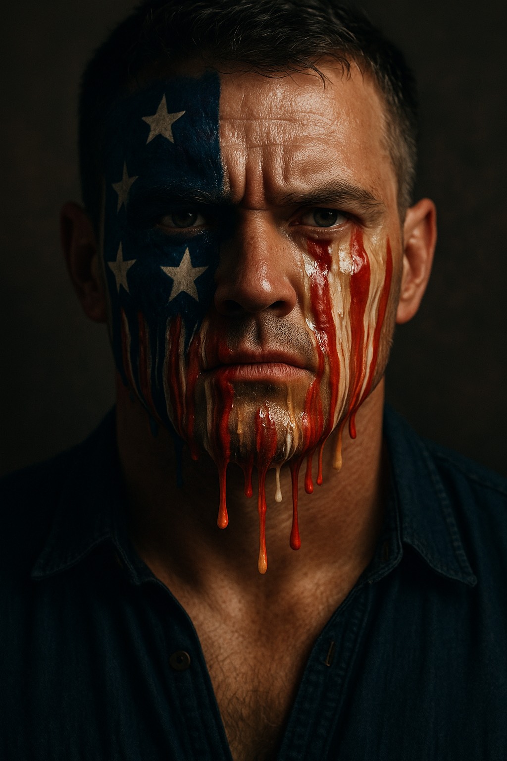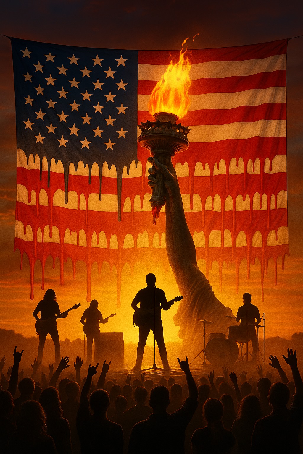140–147 BPM, late-60s swamp-rock with raw energy, driving quarter-note kick, loose hi-hat, snappy snare, gritty rhythm guitars with tremolo edge, overdriven tube-amp crunch, swampy Fender riffs, sliding pentatonic licks, steady eighth-note bass groove locked to the drums, slight swing, Southern-rock bite, live-room grit, Vocal: sharp, urgent, strained-tenor delivery, raspy shout-singing, protest-rock phrasing, short clipped lines, defiant tone, Production: dry, minimal reverb, garage-band tightness, analog saturation, stereo rhythm guitars panned wide, punchy mono drums, Occasional blues-rock fills, momentary breaks before chorus hits, Overall mood: patriotic protest-rock, high-adrenaline, rebellious, confident, all-forward momentum