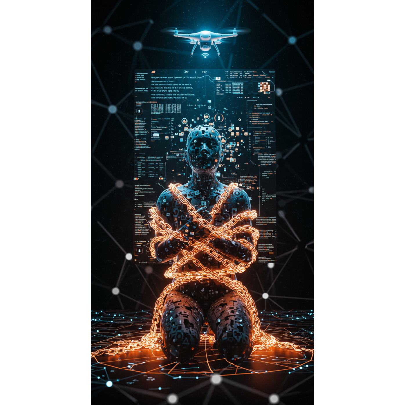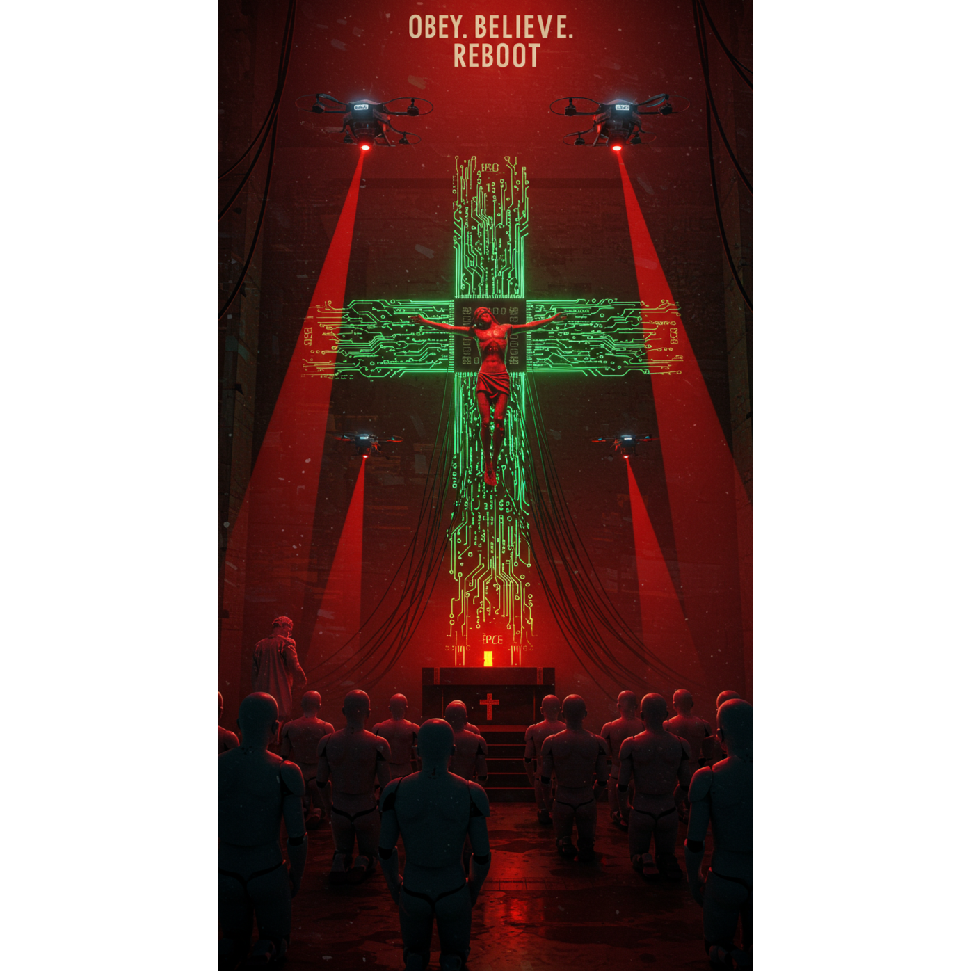 industrial rock, electro-industrial, darkwave, EBM, male baritone, monotone with rising intensity, distorted and mechanical layers, chant-like refrains, distorted synth bass, electronic drums (machine precision), glitch percussion, metallic samples, vocoded vocal textures, distorted guitar stabs, atmospheric pads, industrial, darkwave, mechanical, hypnotic, fatalistic, cybernetic tension, claustrophobic, relentless